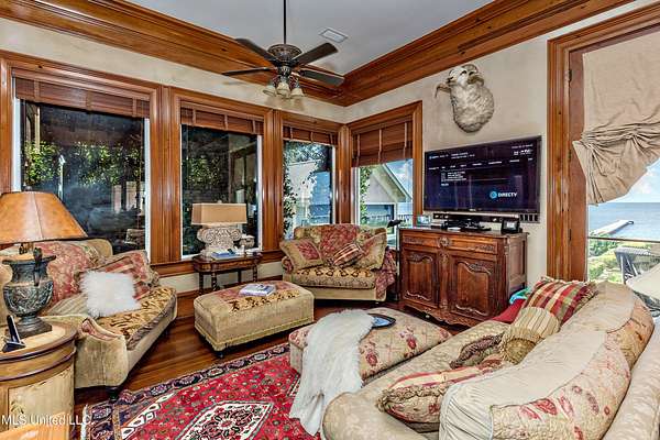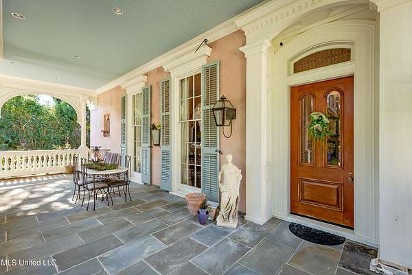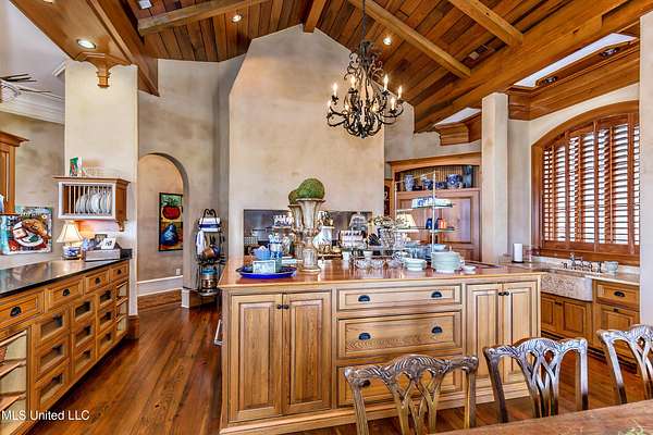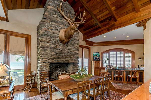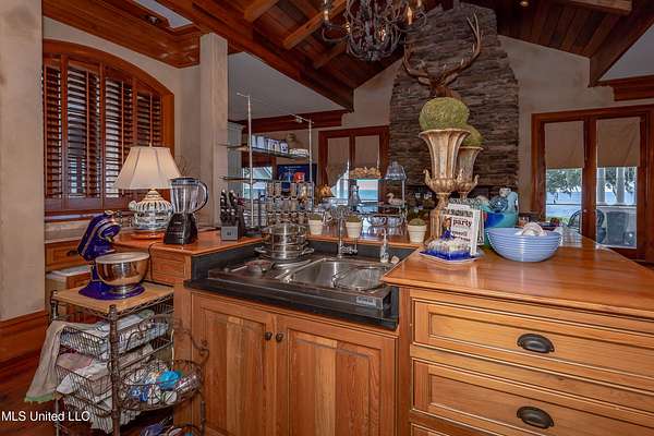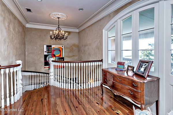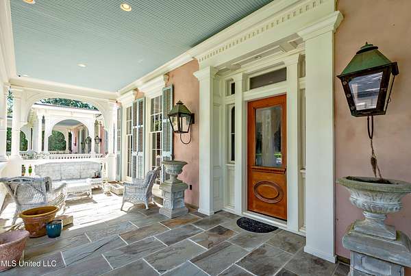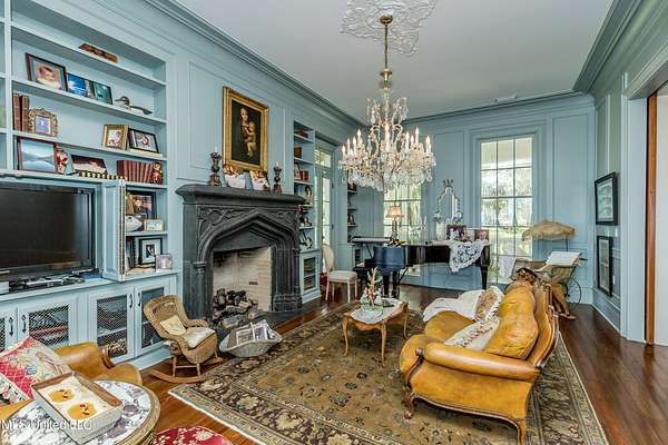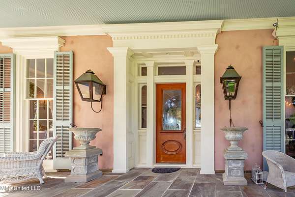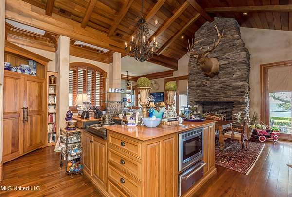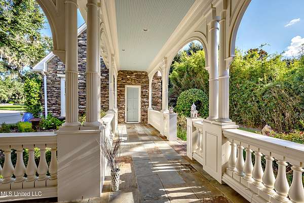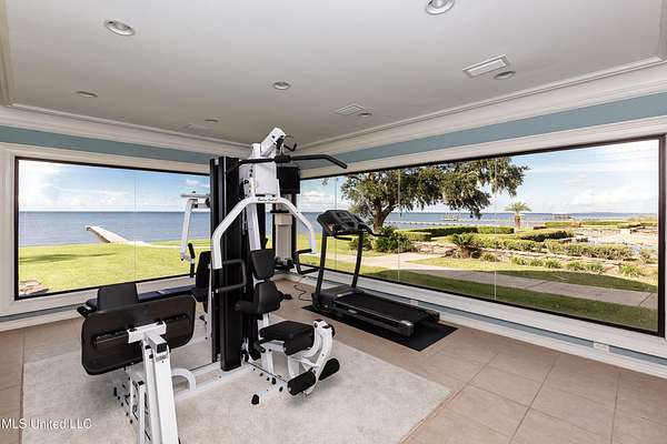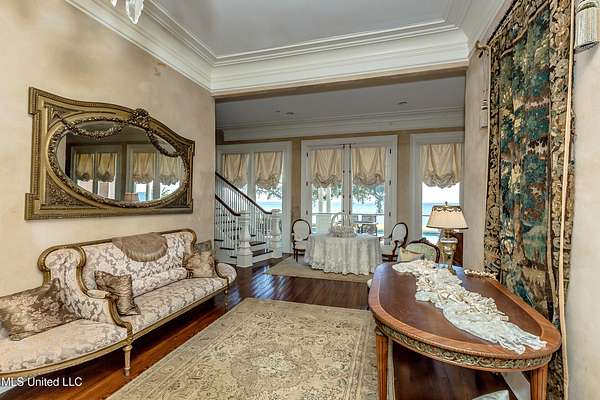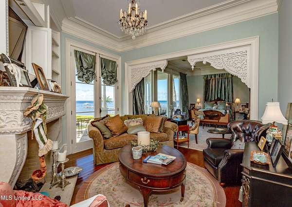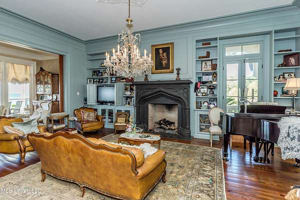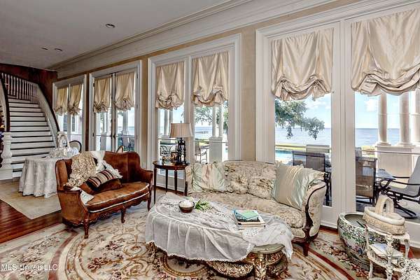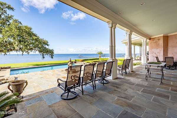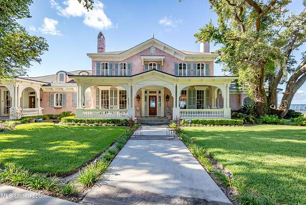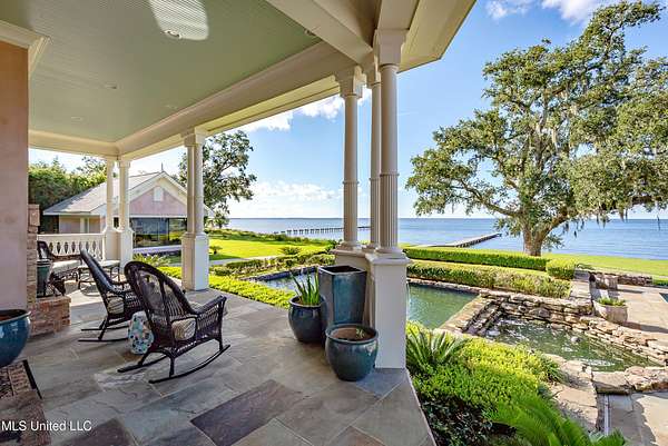 Experience timeless elegance and refined craftsmanship in this breathtaking gulf-front estate offering over 7,000 sq ft of living space on almost 4 private, gated acres. With 242' of concrete bulkhead and a 225' pier with new decking, this rare property blends world-class design, imported finishes, and modern luxuries into a truly one-of-a-kind coastal sanctuary. Grand Entry with timeless priceless chandeliers and custom stone fireplaces. The cantilevered floating spiral staircase is captivating elegance and Venetian plaster walls frame the luxury quality of the architectural New Orleans style home. 12' ceilings downstairs, 10' upstairs, with 10-12'' baseboards and 8-piece crown mouldings. Heart of Pine floors from New Orleans and antique chandeliers imported from England. Custom Sinker Cypress cabinetry, doors, and window casings throughout, including 9' Cypress doors downstairs and 7' upstairs. Corbels imported from Canada, Pennsylvania Blue Stone, and stone fireplaces (including a replica of the Biltmore fireplace imported from Asheville and a custom piece from Atlanta). Interior woodwork imported from New Orleans and St. Louis. Automatic/electric shades, wood shutters, and custom built-ins enhance every space. Chef's kitchen with commercial-grade gas stove, built-in refrigerator/freezer, vaulted Cypress ceiling, and expansive custom cabinetry. Multiple stone fireplaces, including a dramatic stacked stone centerpiece. New large theatre room (1,100 sq ft) above the garage for entertaining. Five-zone air conditioning system, all units just a few years old. 20' stacked stone wall with cascading waterfall in the private courtyard. Glass-walled gym approx (15x15) with panoramic water views. Chlorine pool, koi ponds, and new irrigation well. Outdoor lighting across the entire property creates an enchanting evening atmosphere. Three double garage doors with ample storage and access. Nearly 4 acres of gated Gulf-front land with manicured grounds and ponds. Pennsylvania Blue Stone pathways and custom outdoor living spaces perfect for entertaining. This estate is more than a residence-it is a statement of timeless luxury and unmatched craftsmanship, offering privacy, elegance, and the ultimate Gulf Coast lifestyle.