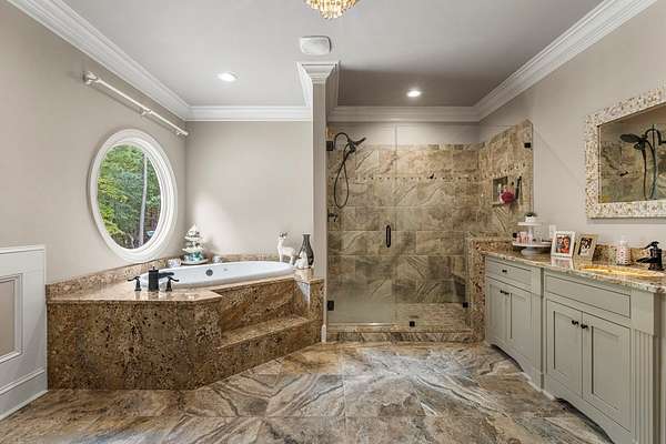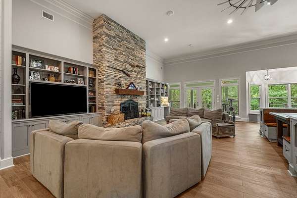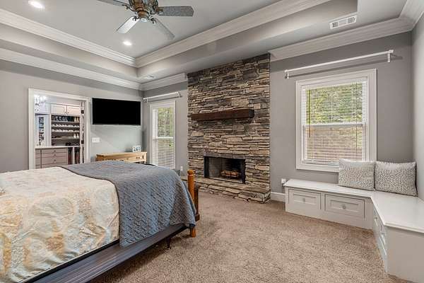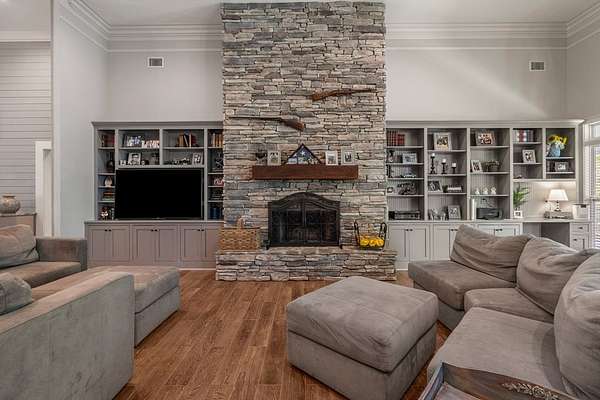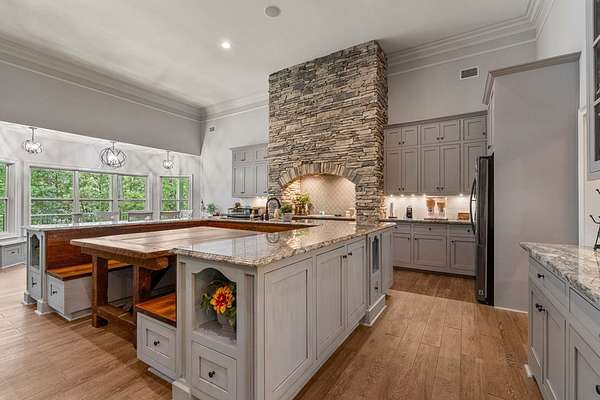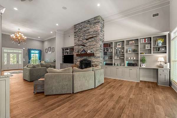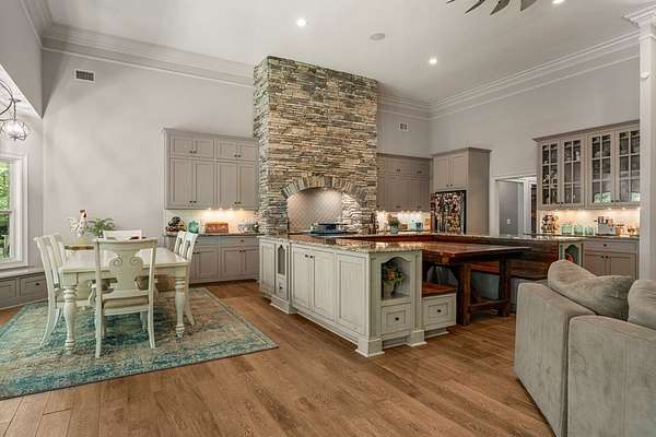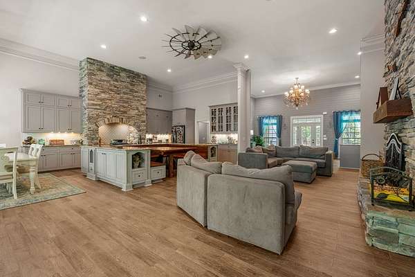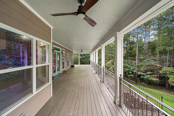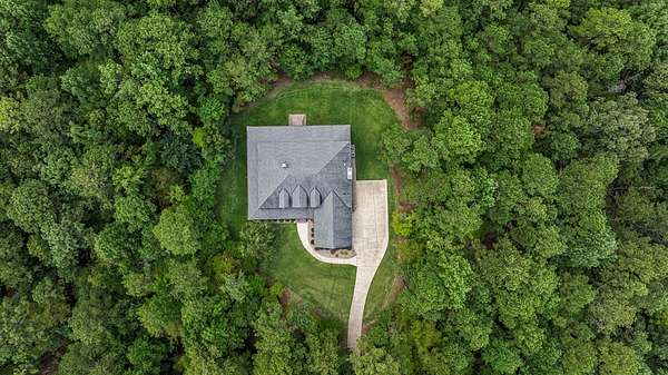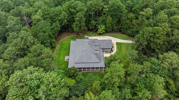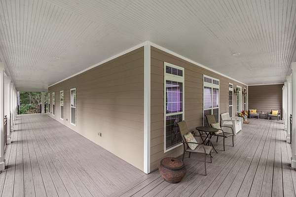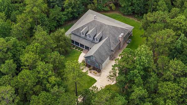 This beautiful home is tucked away behind a private gated drive. Sitting on 12.8 acres of land this elegant home offers a wrap around porch, giving almost a 360 degree view of beautiful hardwood and pine. A sweeping weeping willow offers shade and beauty for anyone enjoying the porch. Inside you are greeted with 12ft ceilings, shiplap through out the foyer, passing through the foyer you enter into the living room with a large stone fireplace welcome guests to sit and enjoy the natural light from the many windows looking out into the tree line. The kitchen offers a large breakfast area and a wrap around island with extra seating for friends and family. Many custom cabinets through out the kitchen gives plenty of room for storage. Just off the kitchen is the Primary Bedroom with it's own grand fireplace, large walk in closet with folding island and complete with all the built-ins of your dreams. The Primary bathroom offers double vanity, walk-in tiled shower, and separate tub. Just outside the Primary room is a large walk-in pantry and a separate laundry room with cabinets, countertops and a sink. Upstairs you will find a 5th bedroom with a bathroom attached. Back downstairs on the opposite side of the home are 3 additional bedrooms all leading to a bathroom. This home is the perfect place to wind down at the end of the day enjoying the porch or cooking with your family.