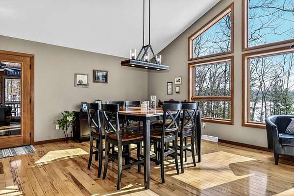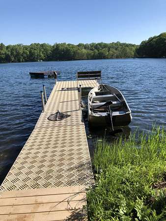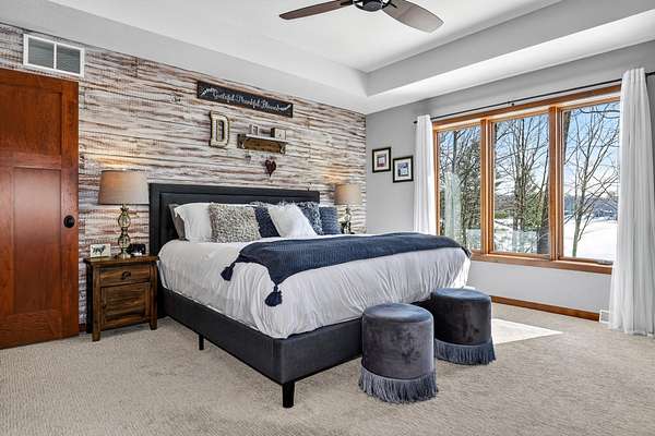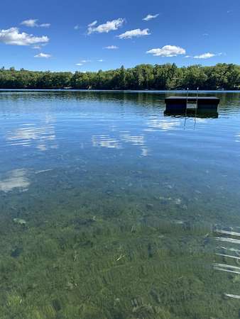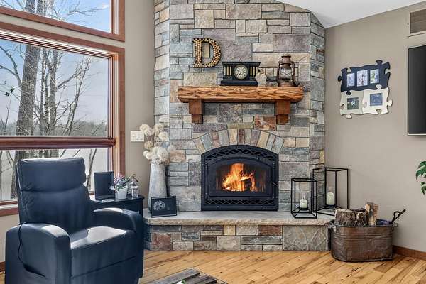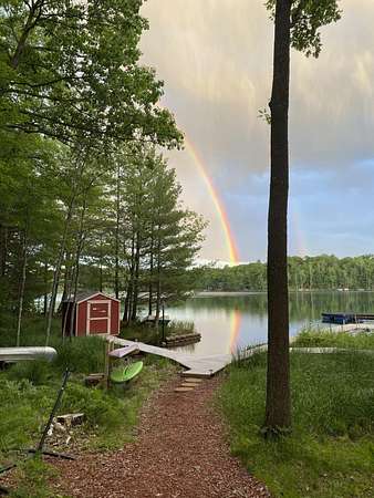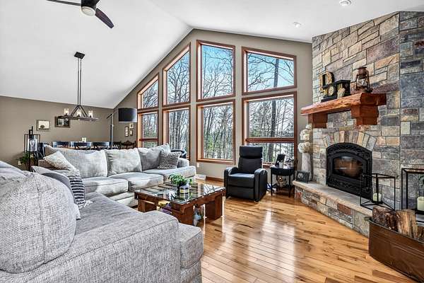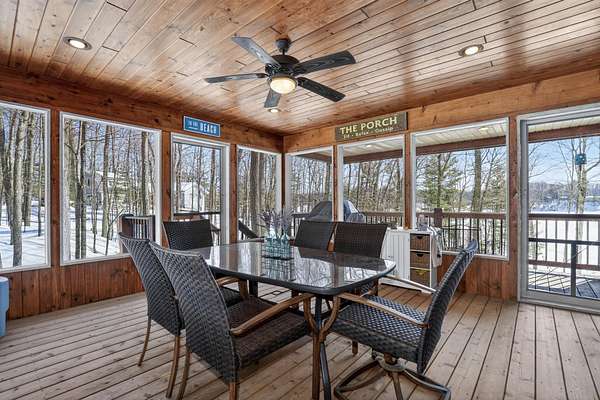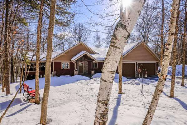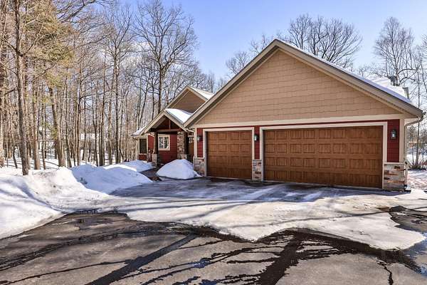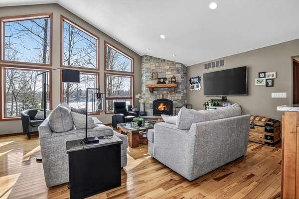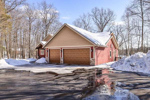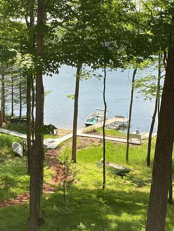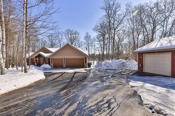 Beautiful custom built home with 250 feet of frontage on crystal clear, 69 acre Lee lake, with no public access. This 3 bedroom home, with its massive cathedral ceiling living room is an open concept dream and with its expansive window views, is a must see! The wood fireplace is used to keep you warm in the winters, while the in-floor heat of the lower level, never lets your feet get cold. Off the main floor is a beautiful screen porch with its own grilling deck and a staircase that leads right to the custom stone patio. Enjoy the serene quiet sitting on the lower patio with views of the lake and wildlife. Additionally, there is a one of a kind custom home theater room, exercise room with the attached hobby room, extra storage & a second staircase leading into the garage. A separate 30 x 50 heated garage, blacktop driveway all on 1.8 acres of wooded property. Enjoy all of this on a dead-end road and access to nearby Bearskin Trail.