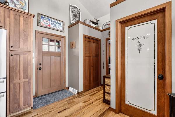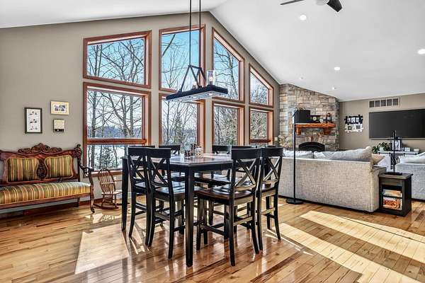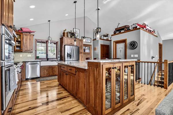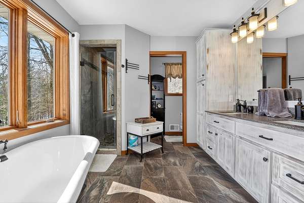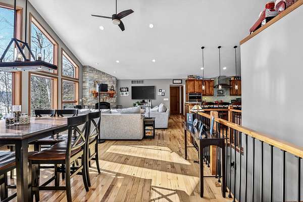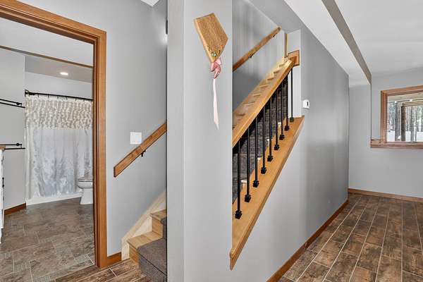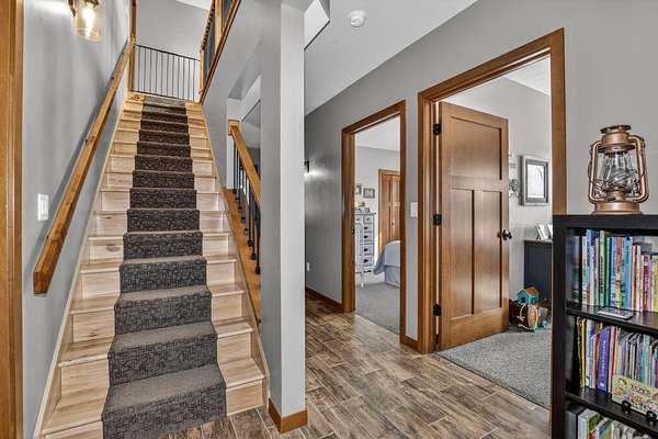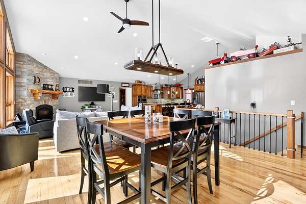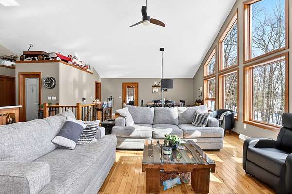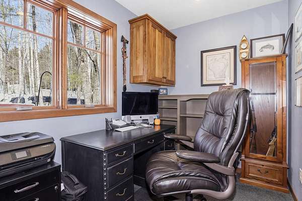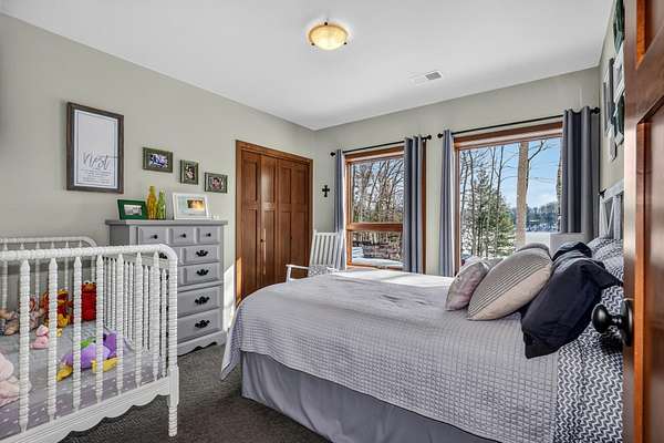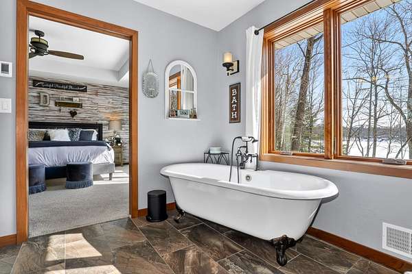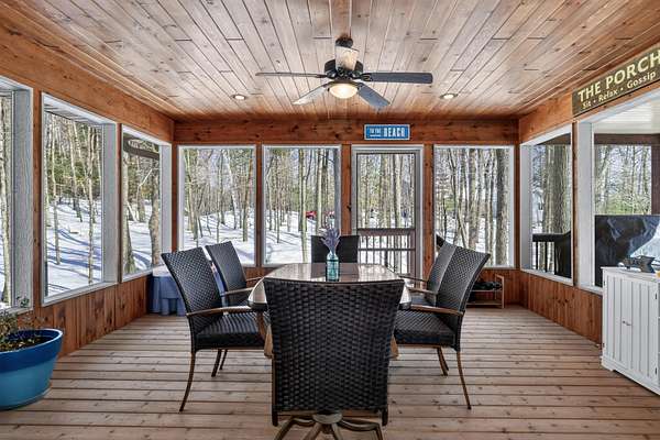 Beautiful custom built home with 250 feet of frontage on crystal clear, 69 acre Lee lake, with no public access. This 3 bedroom home, with its massive cathedral ceiling living room is an open concept dream and with its expansive window views, is a must see! The wood fireplace is used to keep you warm in the winters, while the in-floor heat of the lower level, never lets your feet get cold. Off the main floor is a beautiful screen porch with its own grilling deck and a staircase that leads right to the custom stone patio. Enjoy the serene quiet sitting on the lower patio with views of the lake and wildlife. Additionally, there is a one of a kind custom home theater room, exercise room with the attached hobby room, extra storage & a second staircase leading into the garage. A separate 30 x 50 heated garage, blacktop driveway all on 1.8 acres of wooded property. Enjoy all of this on a dead-end road and access to nearby Bearskin Trail.