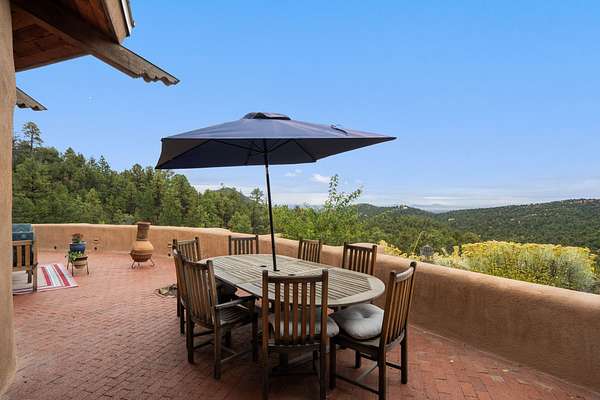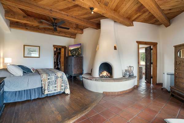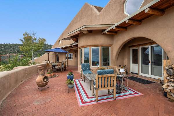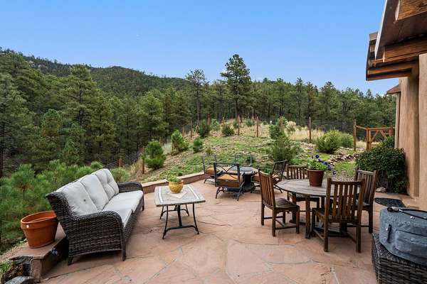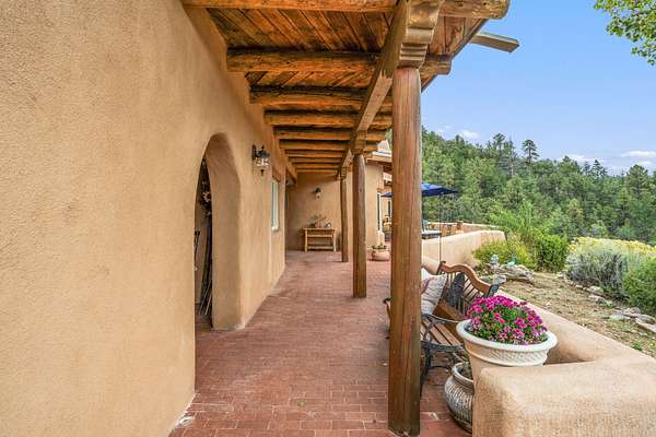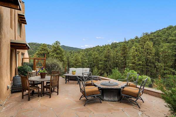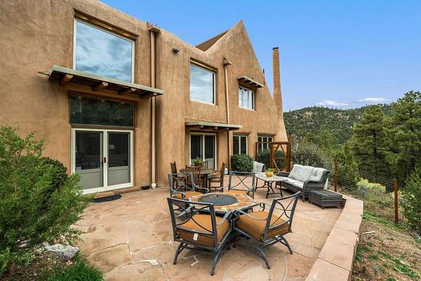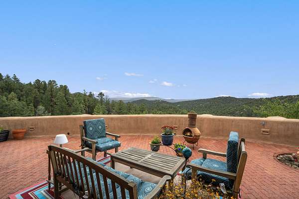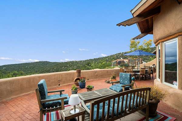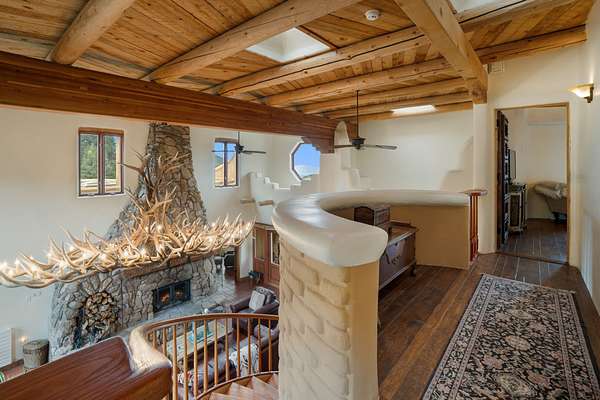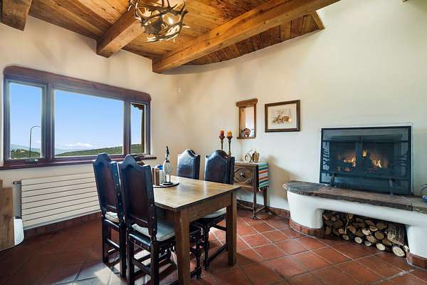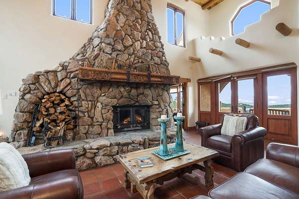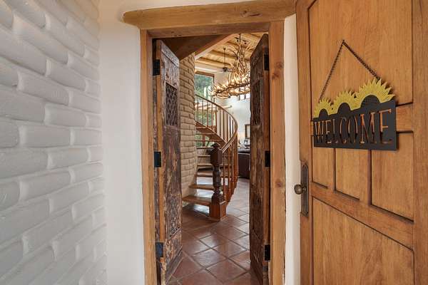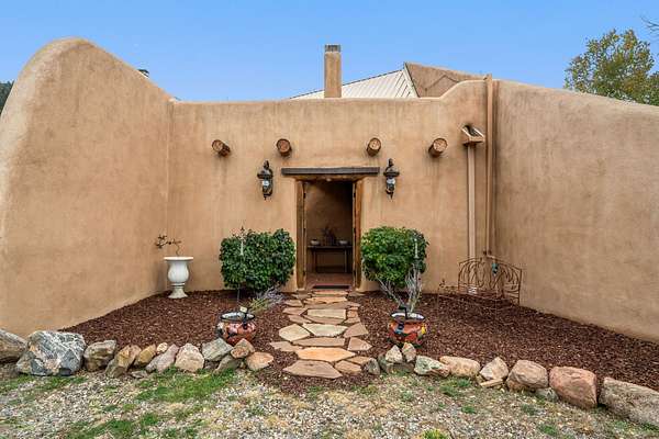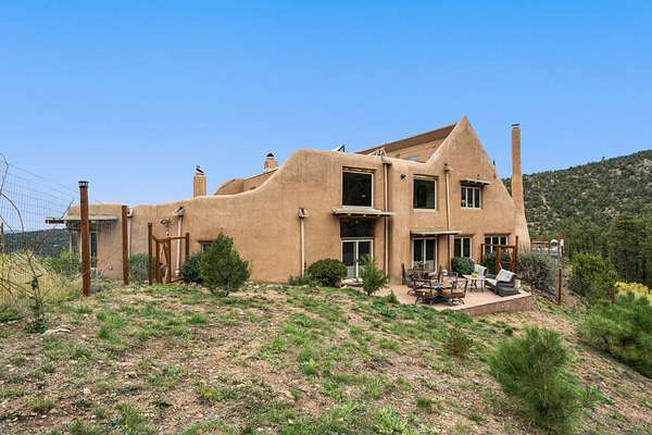 Nestled on 78 pristine private acres spread across four deeded lots, this extraordinary estate offers a blend of seclusion, artistry and timeless Southwestern charm just 25 minutes from downtown Santa Fe. The 4,400 square foot adobe home is a masterpiece of craftsmanship and comfort. Solid adobe construction provides natural insulation that keeps interiors warm in winter and cool in summer. Inside, four ensuite bedrooms and 4.5 baths offer comfort and privacy while 30 hand carved doors and accents from Seret and Sons lend a one of a kind artistic touch throughout the home. The great room is the heart of this residence anchored by a dramatic stone fireplace, high viga ceilings and a custom antler chandelier that adds rustic elegance. French doors open to a spacious front portal framing sweeping views of the Sangre de Cristo Mountains. A graceful circular staircase leads to the upper level where two ensuite bedrooms and a balcony overlooking the great room create an inviting sense of openness and connection. The kitchen is both functional and charming with granite counters, abundant cabinetry and a cozy breakfast nook warmed by its own fireplace. Saltillo tile floors flow throughout the main level while hardwood floors add warmth upstairs. The primary suite is a private retreat with panoramic mountain views and a luxurious bath with a jetted tub, tiled shower and granite counters. Step outside to a fenced backyard and patio perfect for watching the weather in the distance, peaceful wildlife and star filled nights. Additional features include solar hot water, four fireplaces, a two car garage, two sheds and a chicken coop with eight hens that provide fresh eggs daily. This property is more than a home. It is a work of art set deep in nature offering tranquility, authenticity and soul. Experience a place where art, architecture and landscape come together in harmony.