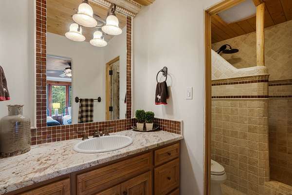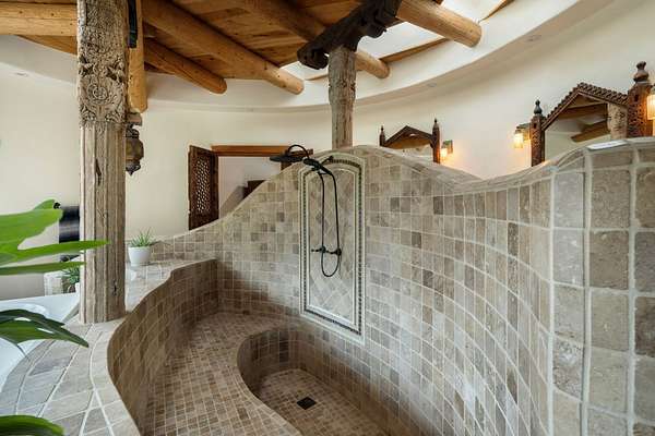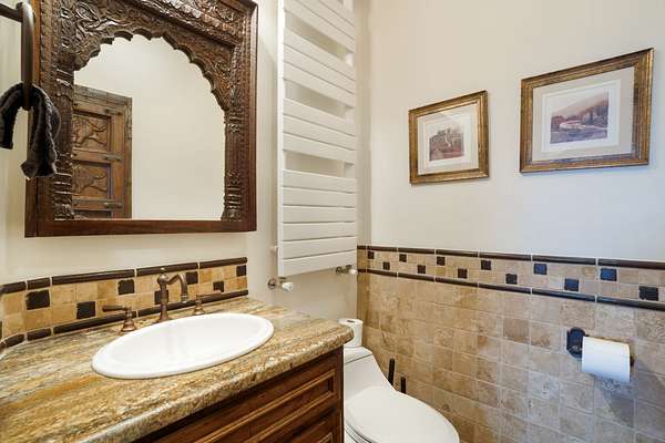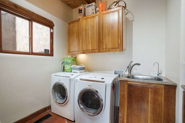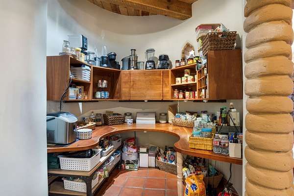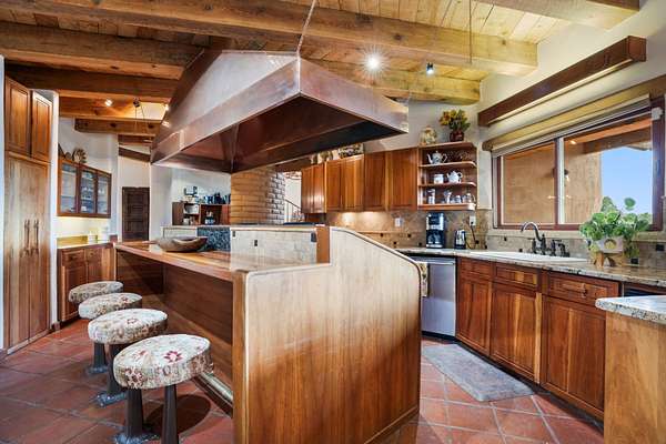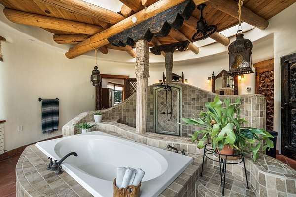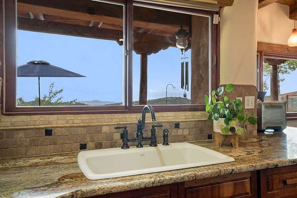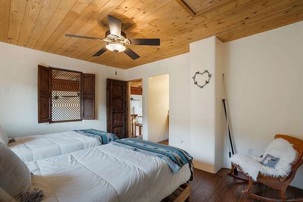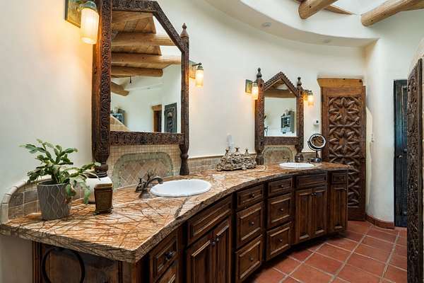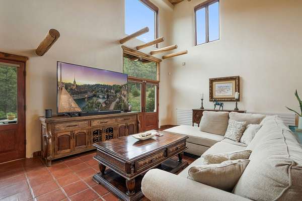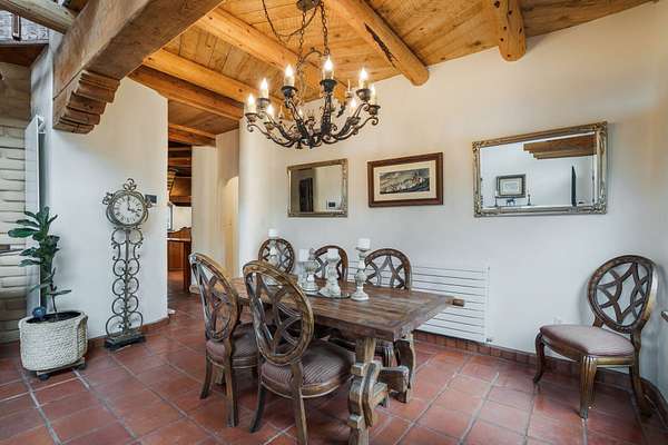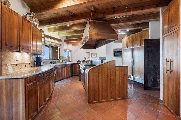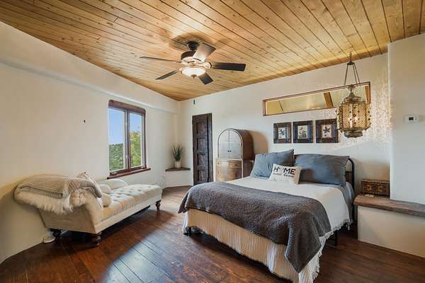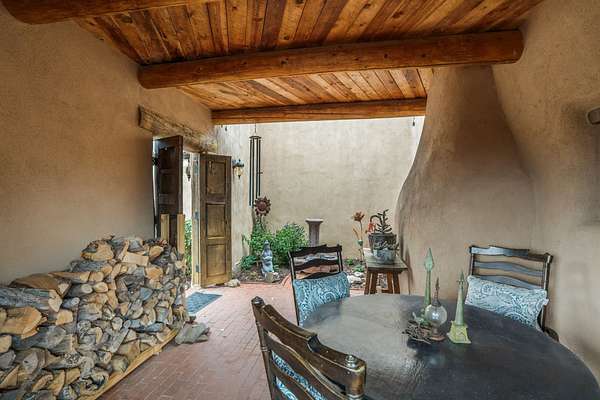 Nestled on 78 pristine private acres spread across four deeded lots, this extraordinary estate offers a blend of seclusion, artistry and timeless Southwestern charm just 25 minutes from downtown Santa Fe. The 4,400 square foot adobe home is a masterpiece of craftsmanship and comfort. Solid adobe construction provides natural insulation that keeps interiors warm in winter and cool in summer. Inside, four ensuite bedrooms and 4.5 baths offer comfort and privacy while 30 hand carved doors and accents from Seret and Sons lend a one of a kind artistic touch throughout the home. The great room is the heart of this residence anchored by a dramatic stone fireplace, high viga ceilings and a custom antler chandelier that adds rustic elegance. French doors open to a spacious front portal framing sweeping views of the Sangre de Cristo Mountains. A graceful circular staircase leads to the upper level where two ensuite bedrooms and a balcony overlooking the great room create an inviting sense of openness and connection. The kitchen is both functional and charming with granite counters, abundant cabinetry and a cozy breakfast nook warmed by its own fireplace. Saltillo tile floors flow throughout the main level while hardwood floors add warmth upstairs. The primary suite is a private retreat with panoramic mountain views and a luxurious bath with a jetted tub, tiled shower and granite counters. Step outside to a fenced backyard and patio perfect for watching the weather in the distance, peaceful wildlife and star filled nights. Additional features include solar hot water, four fireplaces, a two car garage, two sheds and a chicken coop with eight hens that provide fresh eggs daily. This property is more than a home. It is a work of art set deep in nature offering tranquility, authenticity and soul. Experience a place where art, architecture and landscape come together in harmony.