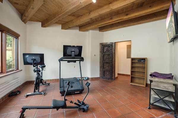 Old Santa Fe Trail to La Barbaria Road. Stay on La Barbaria Road until pavement ends. Then turn left onto La Barbaria Trail. Keep bearing left until the very end of La Barbaria Trail. Once you pass through the big blue gate, you are on the property. Follow the road to the top. Four wheel drive recommended.