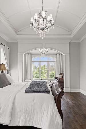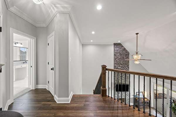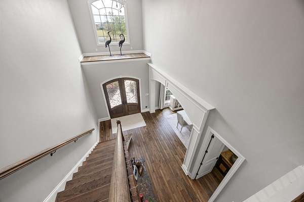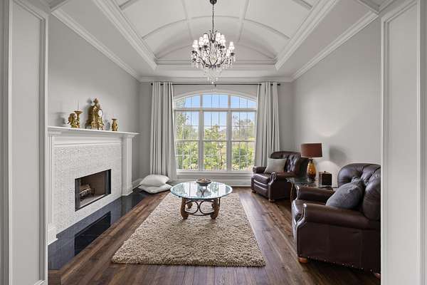 Luxury living awaits in this stunning estate on 5 acres. The grand two-story foyer showcases an elegant staircase, detailed trim, and a Swarovski crystal chandelier. The gourmet eat-in kitchen features custom cabinetry, granite countertops, and stainless-steel appliances, opening to the great room with a soaring stone fireplace. The main level offers two primary suites, including an owner's retreat with a private sitting area, fireplace, spa-like ensuite, custom walk-in closet with island, and access to the expansive patio-plumbed and wired for an outdoor kitchen. Upstairs, three bedrooms each include ensuite baths and generous closets, plus a sitting room overlooking the foyer. The finished walk-out basement adds a third fireplace, open living space, and a new custom bar for entertaining and with access to a second covered patio. A three-car attached garage and a fourth rear garage provide ample storage. With four-zone HVAC and thoughtful design throughout, this home combines comfort, elegance, and privacy.