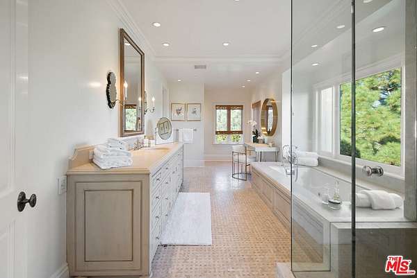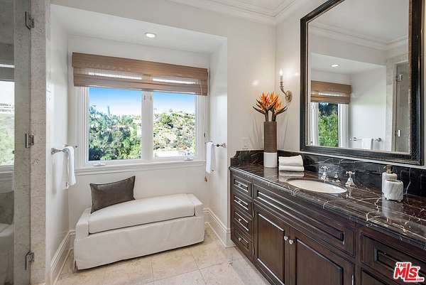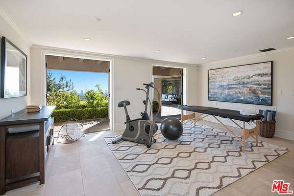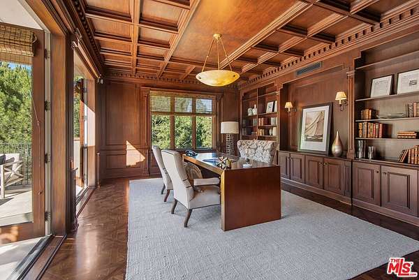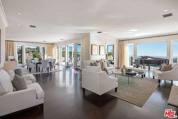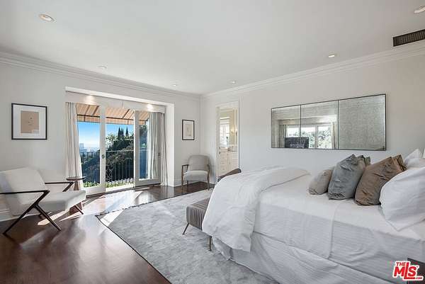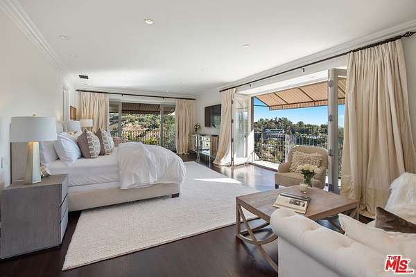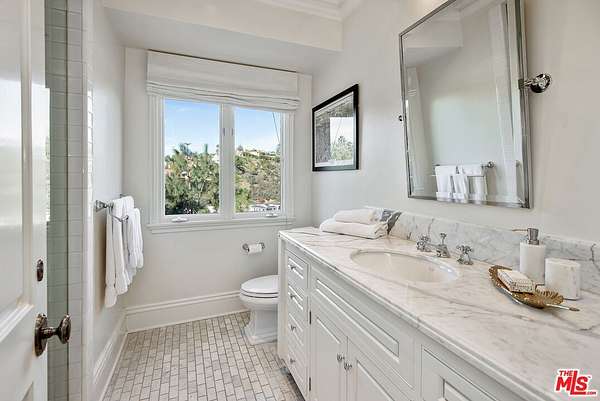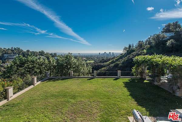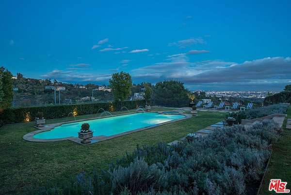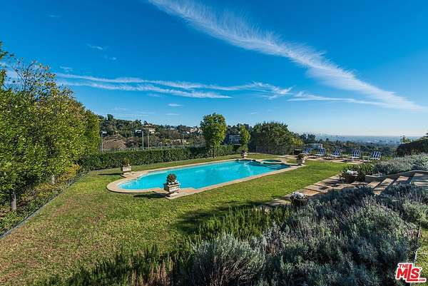 This gated French Country Maison offers 4 bedrooms, 2 staff quarters, 9 baths and gorgeous city views. A long private driveway framed by mature olive trees, white roses & lavender leads to a large motor court. 2-story entry, library, coffered ceilings, and French doors overlook the courtyard. Formal living rm w/views from downtown to Century City on approximately 2 acres. California indoor/outdoor lifestyle w/spacious dining room, gourmet chef's kitchen & breakfast area w/ family room. Lovely verandas, terraces, outdoor BBQ w/fireplace, salt water pool and a pergola. The luxurious primary suite has 2 separate baths & 2 walk-in closets. Open media room, game room, service kitchen, N/S championship Tennis Court, gym, sauna & attached 3-car garage. Furnished only.