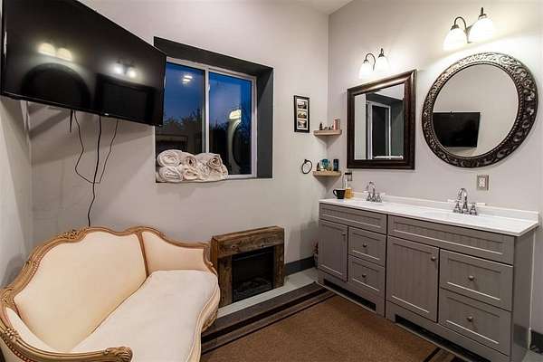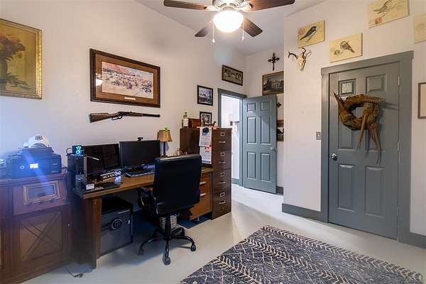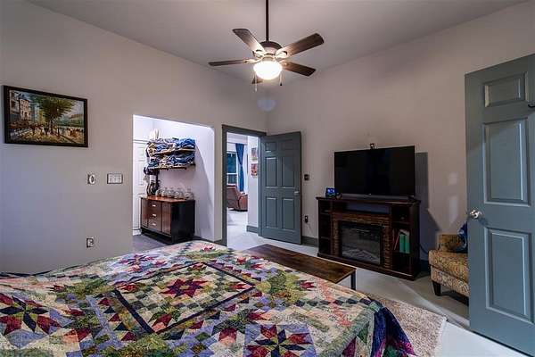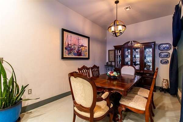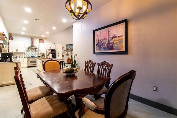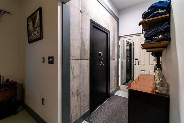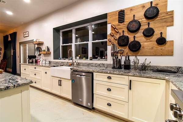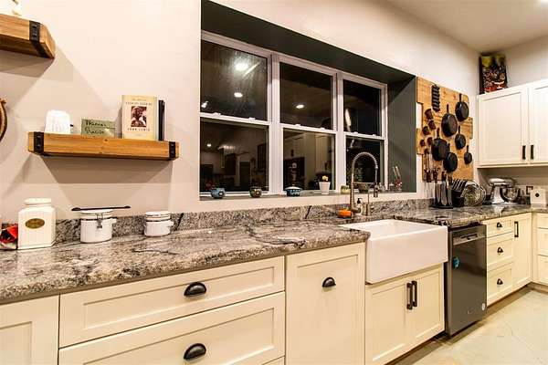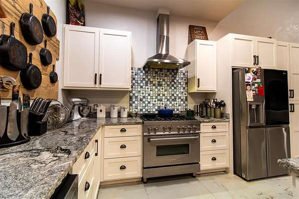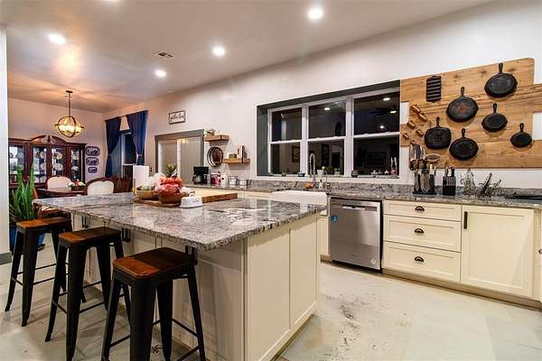 Inside, the split floor plan offers privacy and comfort. The gourmet kitchen boasts custom cabinetry, granite countertops, a farmhouse sink, high-end ZLINE gas range, and an oversized island with bar seating. A formal dining area makes hosting easy. The master suite features a spa-like bath with double vanities and a tiled step-in shower with bench seating. Both bathrooms feature tiled showers, and an interior safe room with reinforced door adds peace of mind.