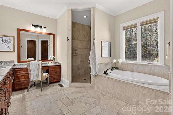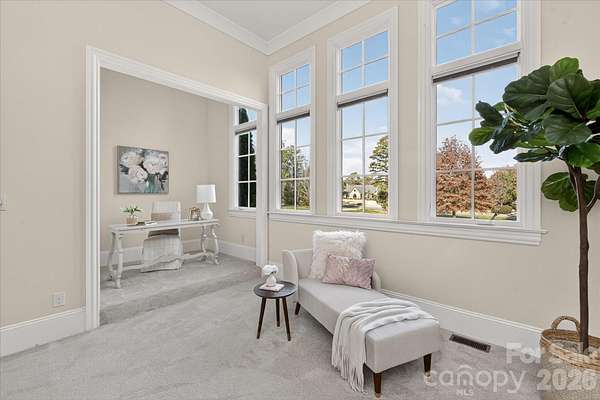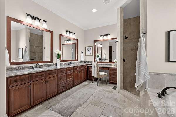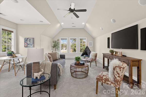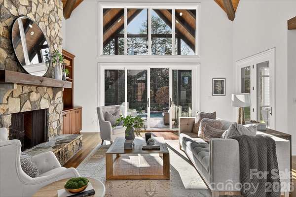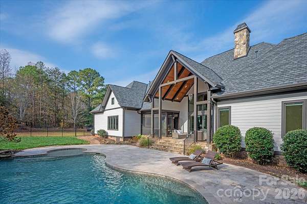 Beautiful luxury ranch home with 4 car garage and salt water pool situated on almost 3 acres in the heart of Marvin. This 2014 build offers a total of 4300sf with over 3500sf of living space on the main floor including a spacious primary suite plus 3 additional ensuite bedrooms. Luxury interior features a gorgeous Great Room with 26 foot vaulted ceiling and cedar beams plus a beautiful 2 story stone fireplace. Light and Bright kitchen features a wall of counter to ceiling height windows and cedar beam ceiling detail. Kitchen has a great appliance package including a 6 burner Viking gas range with double ovens, commercial hood, built in Viking Fridge, pot filler faucet, separate microwave and extra counter beverage fridge. Don't miss the large walk in pantry! Floor plan also features a 770sf second floor with generously sized bonus room + an office and full bath. Don't miss the expansive walk in attic! Home also includes a great drop zone with custom cabinetry, conveniently located cabana bath with direct access to outdoors, plus a dog washing station. Outside, take in the great North Carolina weather on the beautiful screened porch or covered terrace. Resort backyard also features a heated salt water pool with tanning shelf. Along with offering the feeling of privacy, this home is located close to Blakeney Shopping, The Bowl and Waverly shopping. Location also provides easy access to walking trails. BRAND NEW roof with 50 year GAF shingles and all new copper flashing installed in 2025! Great property for privacy or hobby farm! No HOA! Community is animal friendly!