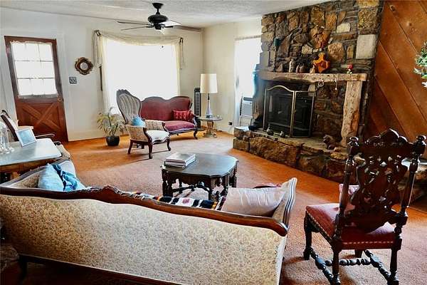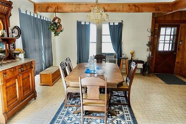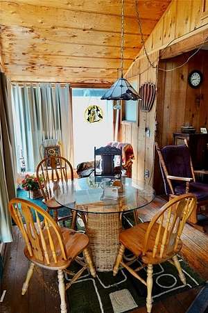 The dining room showcases charming wood beam accents and large windows on two sides, filling the space with natural light. The inviting living room continues the warm wood detailing and centers around a stunning stone fireplace -- a true focal point of the home.