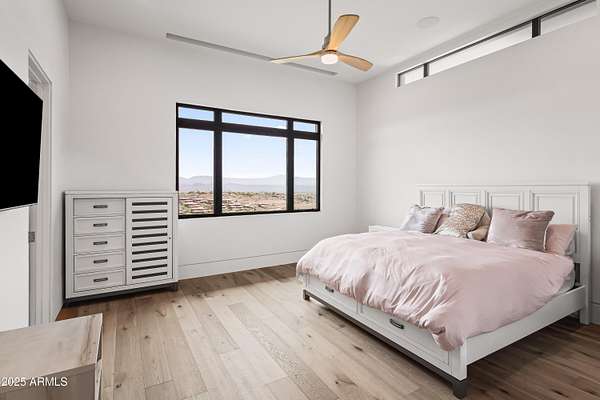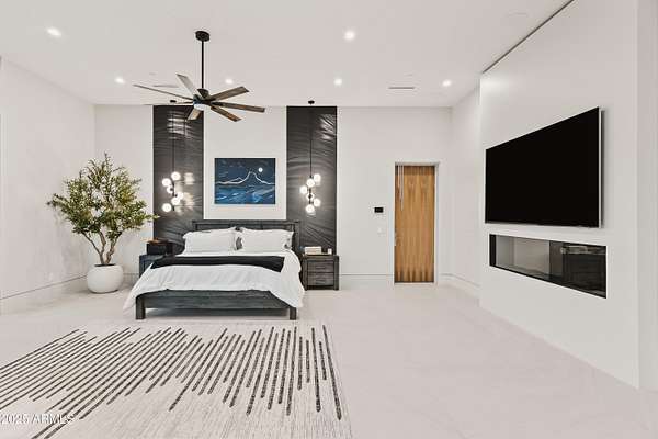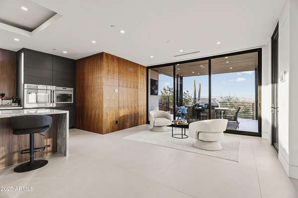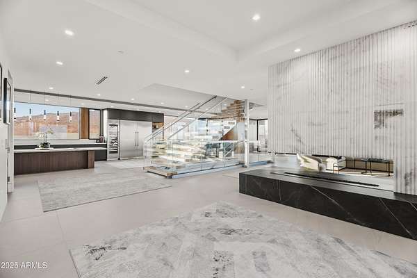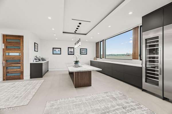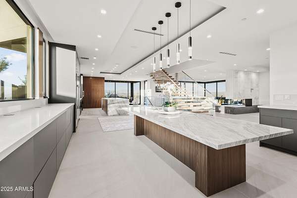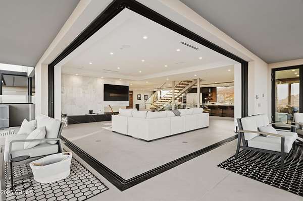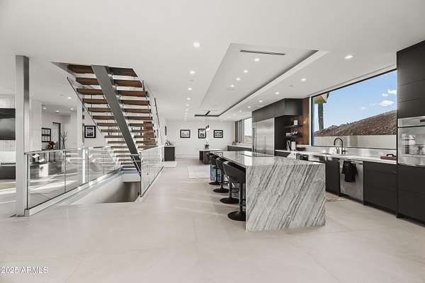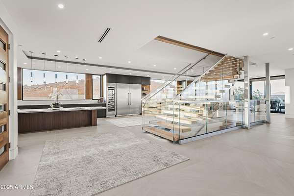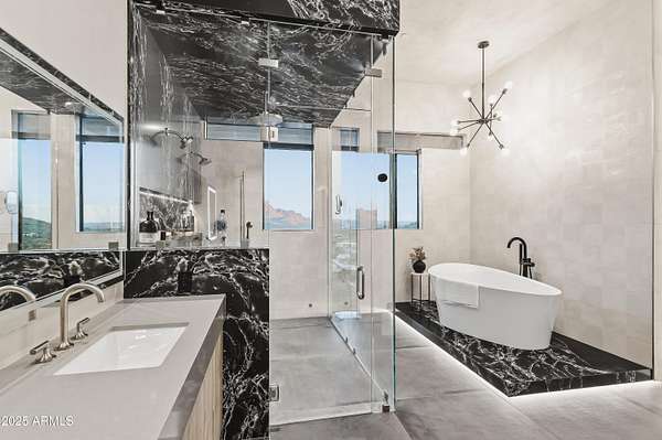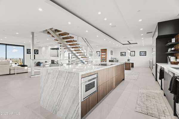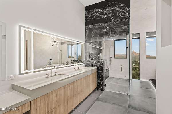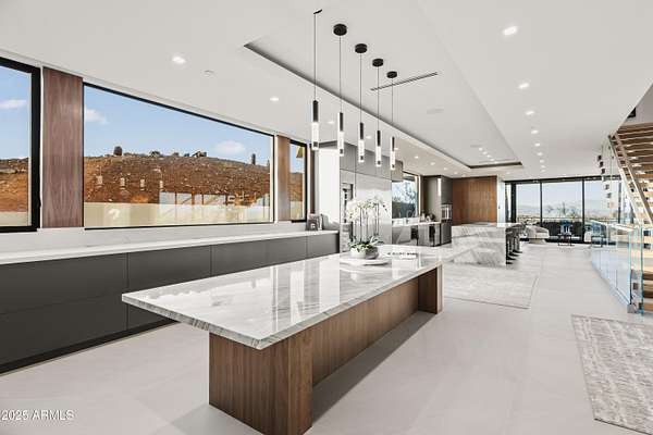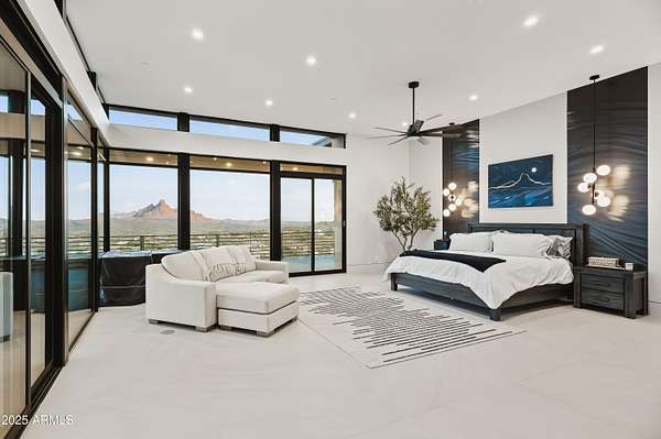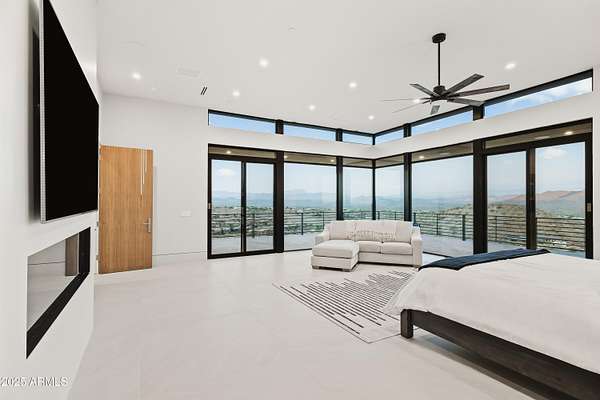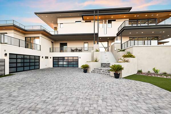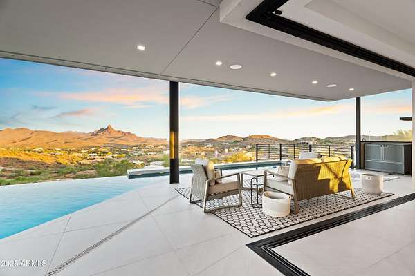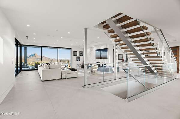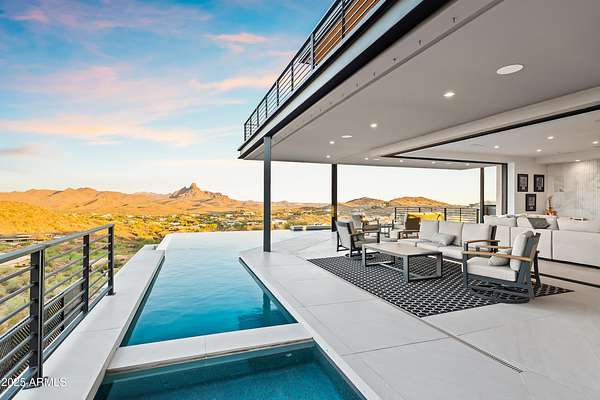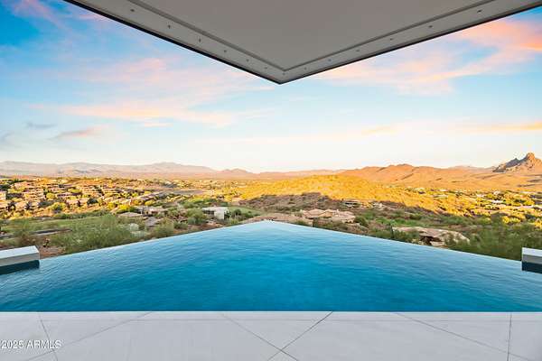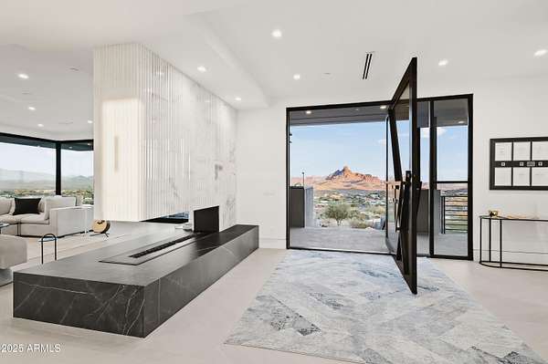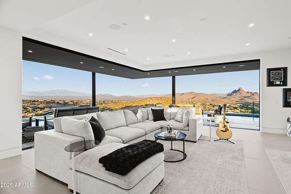 Experience unmatched luxury and innovation in this Luxe Magazine Red Award-winning architectural masterpiece by Tsontakis Architecture with interiors by Emmy Couture. Perched atop one of the highest peaks in FireRock Country Club, this estate spans 1.8 acres and offers 360 degrees mountain and city views from five viewing decks. Defined by striking geometric design, the home features a 27,000-gallon negative-edge heated pool and spa with multi-zone misting, plus fully retractable Arcadia doors that blur the line between indoor and outdoor living. The chef's kitchen boasts Thermador, Sub-Zero, and Miele appliances, dual dishwashers, refrigerated wine storage, induction cooktop, double ovens, and a built-in coffee station. Custom black walnut paneling and doors, designer tile, and Control4 home automation set a new standard in modern luxury. An elevator connects all three levels: a lower-level in-home casita, a main floor with kitchen, living, great room with floating staircase and stone fireplace, and a third-level primary suite with sunrise views, steam shower, freestanding tub, and safe room. Additional highlights include a 4-car garage with a 7,000+ sf paver driveway, professionally landscaped grounds with turf, native plants, and dramatic lighting. Engineered for independence, the residence produces 50,000 kWh annually via 85 solar panels and is backed by 6 Tesla Powerwalls with SPAN smart panels. A private water reservoir, whole-home filtration, and gas/propane integration complete its self-sustaining design. This is more than a home it is a statement of vision, strength, and timeless design.