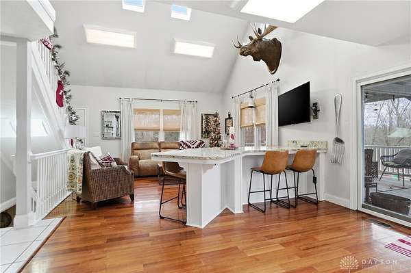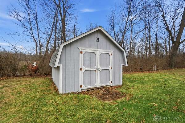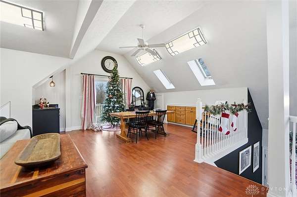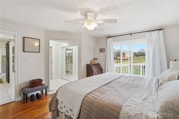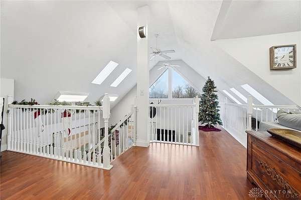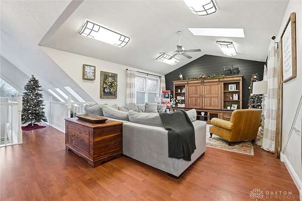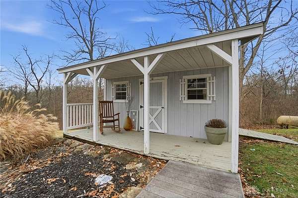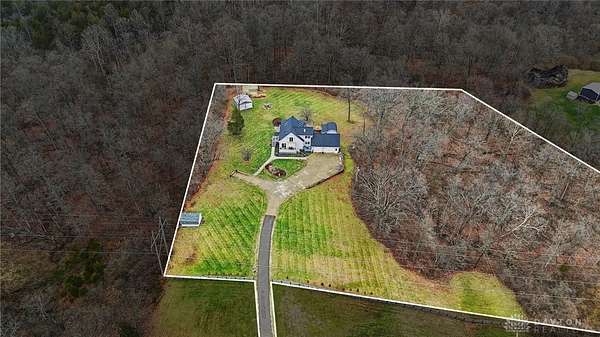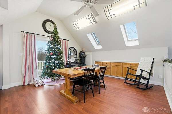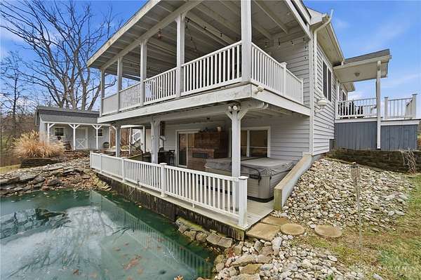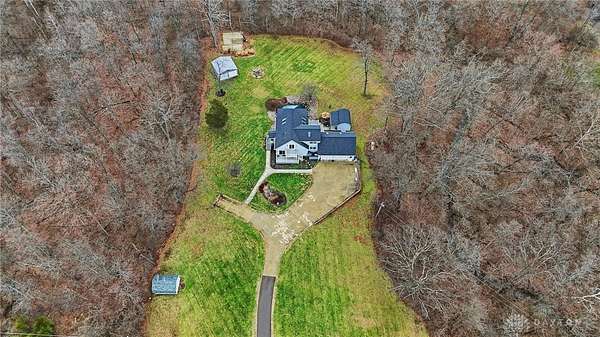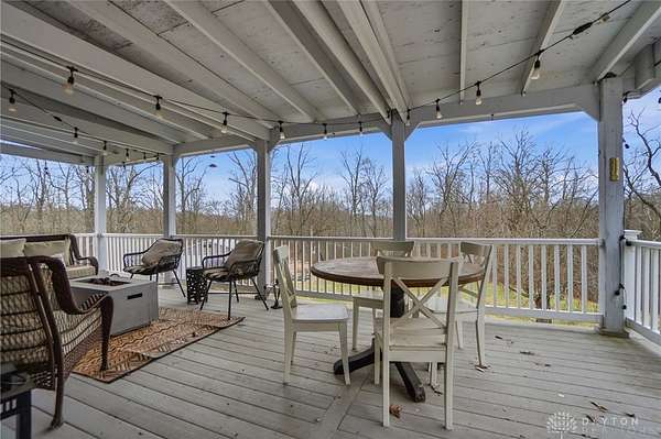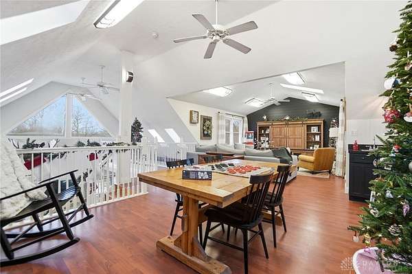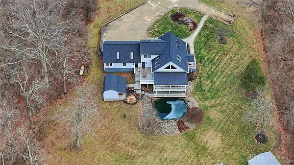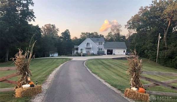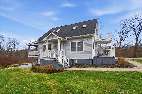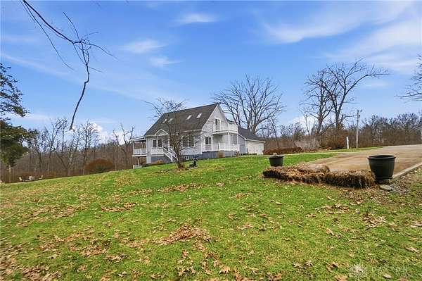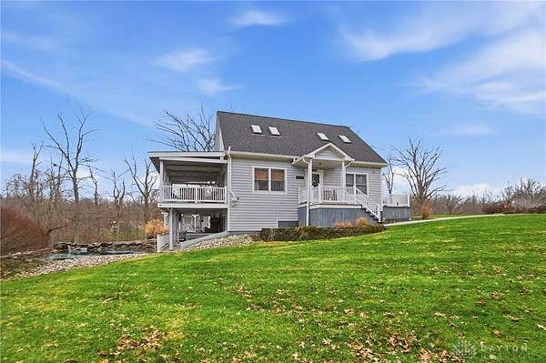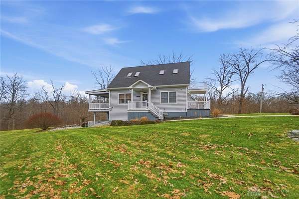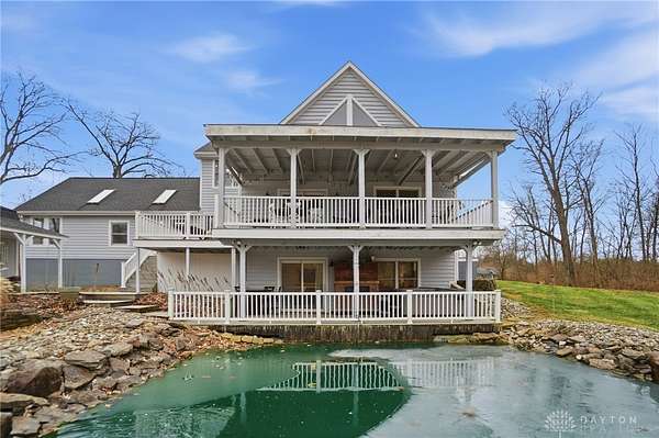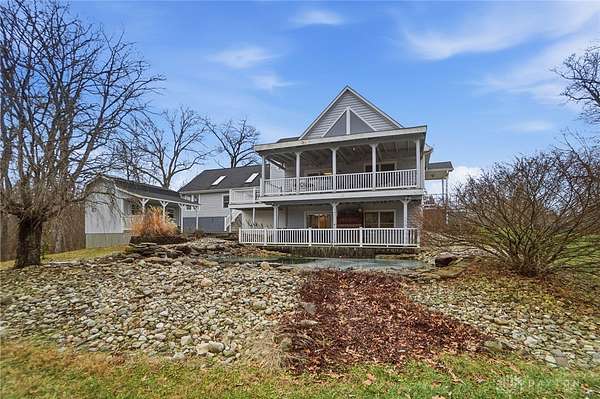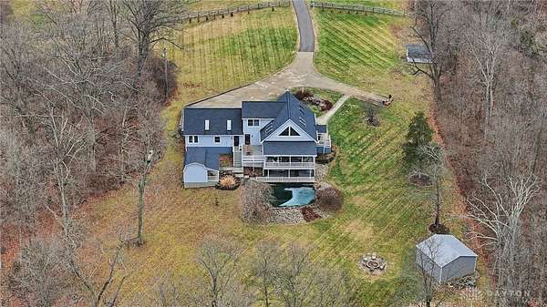 Picturesque, private country retreat on 4.7 stunning acres w/ panoramic views in every direction, this custom-built home offers an incredible blend of comfort, quality construction & inspiring natural surroundings. Featuring 3 bedrooms w/ a possible 4th, 2 full baths & a full finished walkout basement, this thoughtfully designed property showcases solid American cherry hardwood & tile floors, a beautifully remodeled kitchen w/ newer granite countertops, skylights, a large island, walk-in pantry w/ coffee bar & access to the covered deck. The great room impresses with cathedral ceilings, skylights and custom windows, while the open loft with catwalk overlooks the main level for added drama and flexible living space. The main-level owner's suite includes a remodeled bath with tile shower, double vanities and direct access to the deck. The second floor has a large family room and a gathering room, which is perfect for games and gathering with loved ones. The finished walkout lower level offers 2 additional bedrooms (possible 3 - 3rd being used as a family room), a full bath, a small office/art studio and large utility room. The basement has fantastic views of the private rear grounds. Outdoor living is exceptional with approx. 800 sq ft of covered porch & deck space plus 450 sq ft of open wrap aroybd deck space--perfect for relaxing, entertaining & enjoying peaceful country sunsets. Additional highlights include a 3.5-car attached garage, scenic pond, large concrete basketball court, 3 versatile outbuildings including a barn with concrete floor, an electric-ready shed ideal for an art studio, workshop or home office, & a shed at the front of the property great for storage. Located in Franklin Township with no city tax, just minutes to I-75, Austin Landing & convenient commuter access to both Cincinnati & Dayton, this rare property offers character w/ open-concept living, abundant flexible spaces for hobbies, office, exercise or game rooms & a one-of-a-kind setting!