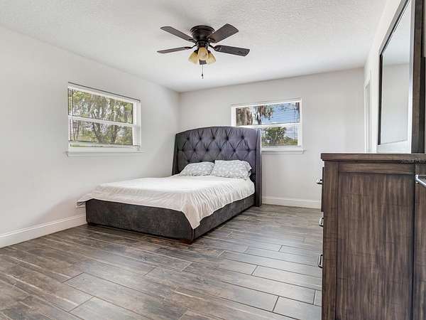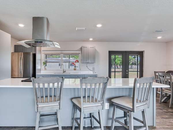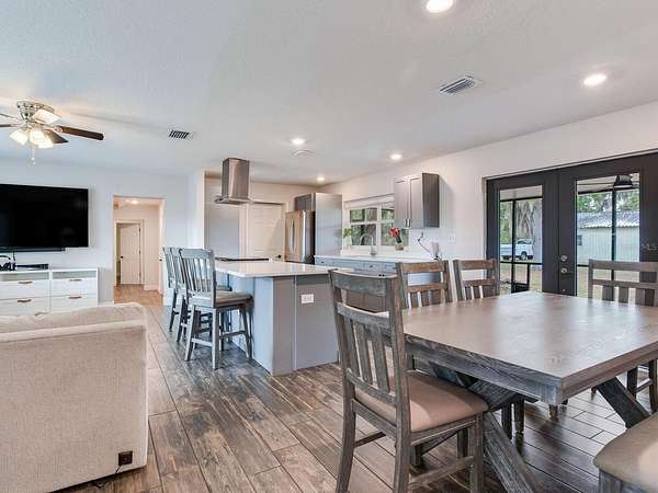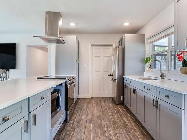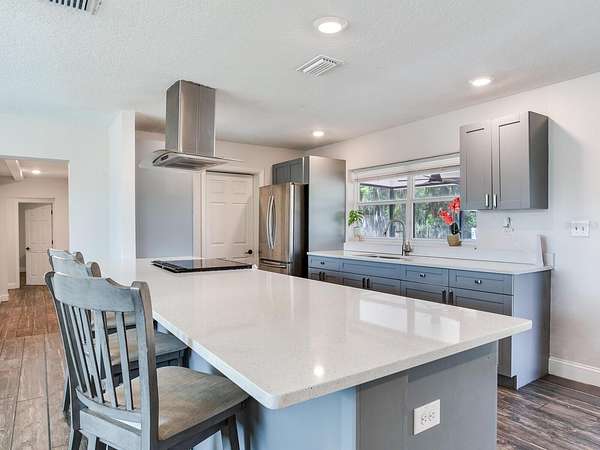 This spacious 5-bedroom, 2-bathroom home has been beautifully maintained and thoughtfully renovated with modern finishes while maintaining its warm, inviting charm—truly move-in ready for its next owners. Inside, you’ll find durable wood-look plank tile flooring flowing seamlessly throughout, creating a cohesive and low-maintenance living space. The heart of the home is the stunning kitchen, featuring an oversized island with a stove/oven combo, a sleek stainless steel floating hood, and plenty of room for gathering and entertaining.