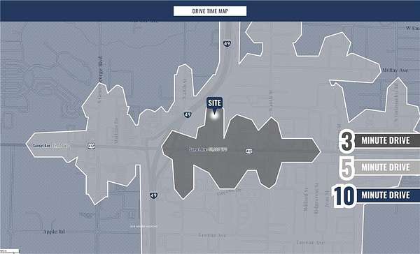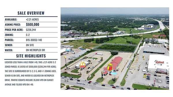 Located less than a mile from I-49, this +-2.21-acre C-2 zoned parcel is listed at $500,000 ($226,244 per acre).