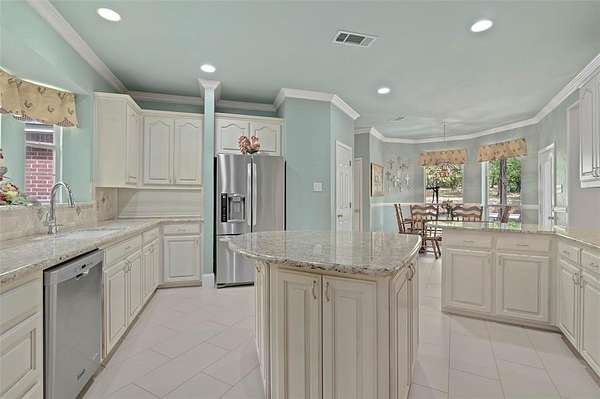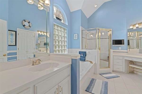 - Cathedral Ceiling(s), Chandelier, Double Vanity, Eat-In Kitchen, Kitchen Island, Paneling, Walk-In Closet(s)