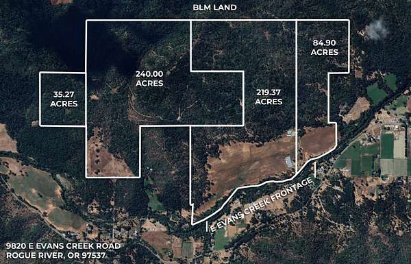 Location, location, location! If you're looking for pasture in the heart of Southern Oregon, this is the one for you! This one-of-a-kind property features 579.54 acres (57+ acres are irrigated and irrigation rights date back to 1881), 4 tax lots (Zonings are EFU & WR), marketable timber, multiple outbuildings, 6 industrial greenhouses, 1200 amps of power, large 3960 sq ft barn, homesite approval, gated access, and nearly 3000 ft of E Evans Creek frontage! Property backs up to BLM and offers a very pleasant setting that feels private yet within 15-20 mins from downtown Rogue River. Truly a perfect opportunity for anyone that wants to build their dream home on a generational ranch and/or grow marijuana. Owner carry terms are considered too. This one won't last long on the market, so contact your agent today for a personal tour, before it's too late!