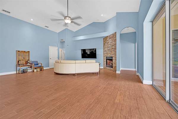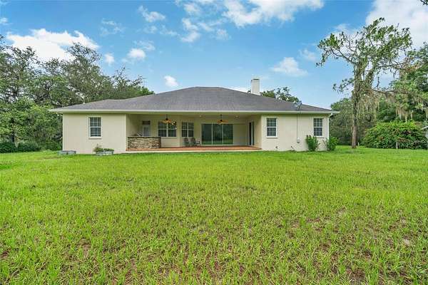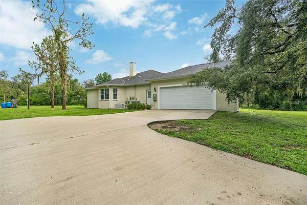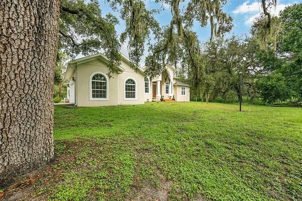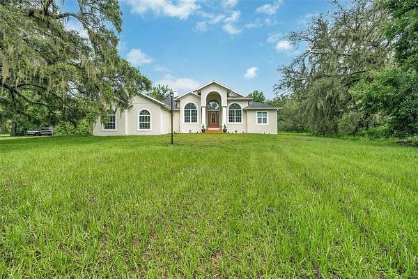 Welcome to this stunning single-story estate, ideally nestled on 6.93 acres of peaceful, tree-lined land, offering privacy, space, and timeless Florida charm. The striking exterior, with arched windows, a grand columned entry, and natural surroundings, sets the tone for the comfort and elegance within.