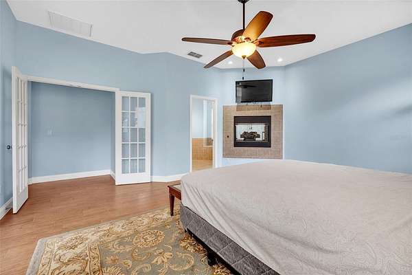 Retreat to the luxurious primary suite, which includes a double-sided gas fireplace that connects to a spa-inspired bathroom, creating a peaceful, retreat-like atmosphere.