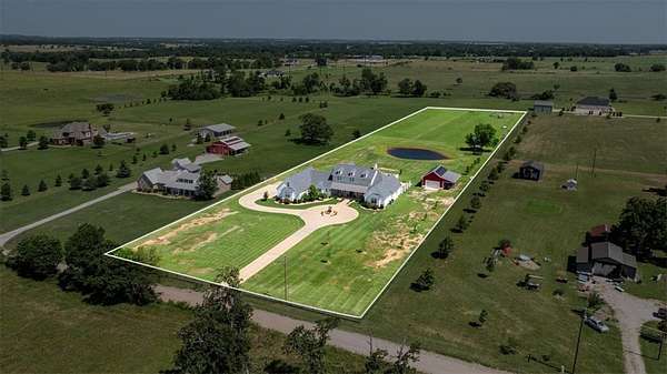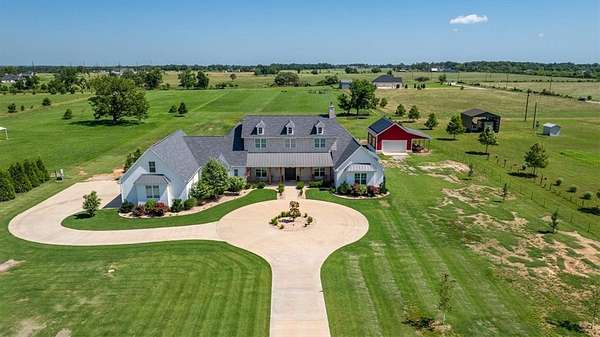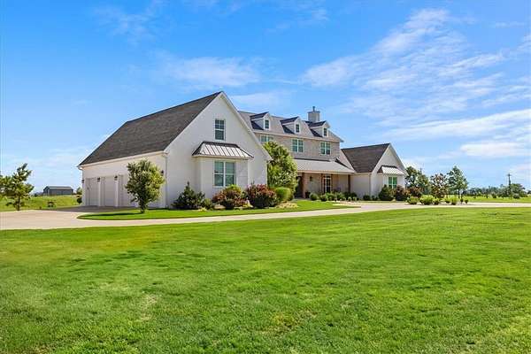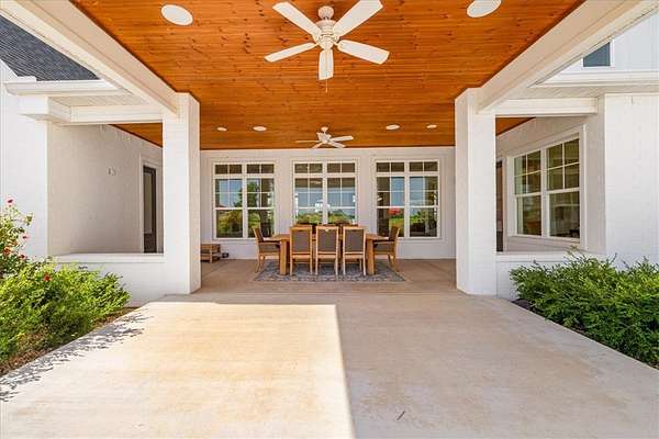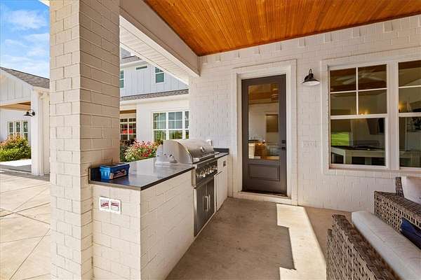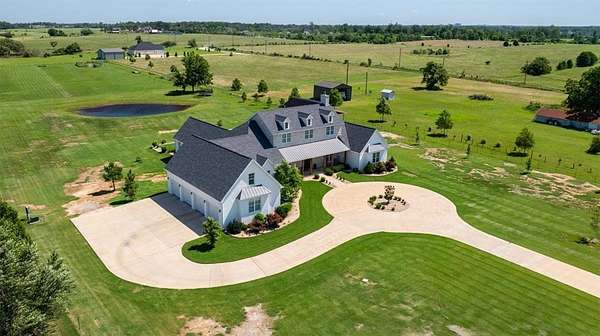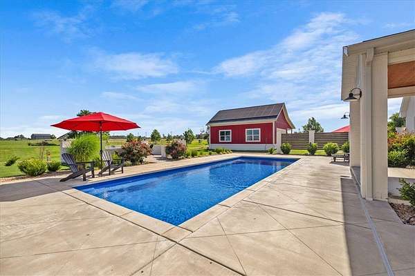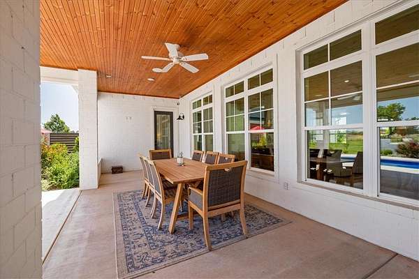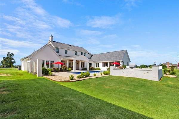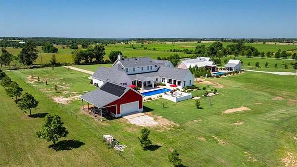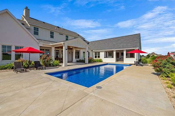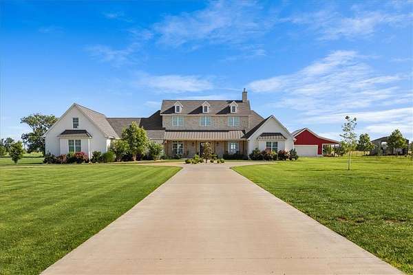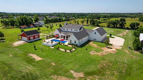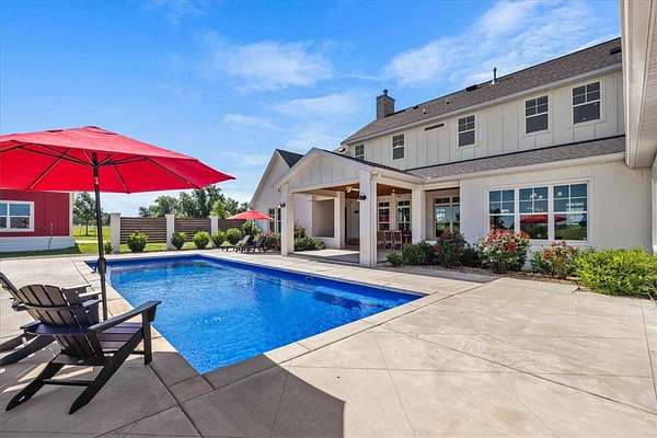 Stunning custom Colonial-style farmhouse on 5.4 acres in Bentonville with over 5,800 sq ft of living space and 1,400+ sq ft of covered patio. Main level features 3 spacious bedrooms with en-suite baths; upstairs offers 2 oversized bedrooms with a Jack & Jill bath. Chef's kitchen includes Wolf range, built-in fridge/freezer, farmhouse sink, ice maker, and custom cabinetry. Butler's pantry with prep sink, floor-to-ceiling storage, and second dishwasher. Enjoy outdoor living with a large in-ground pool, mature landscaping, and multiple covered patios. Circular driveway adds curb appeal and convenience. Ideally located between XNA, Pinnacle Promenade, and downtown Bentonville-offering luxury, privacy, and accessibility.