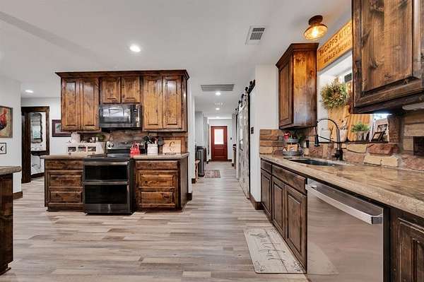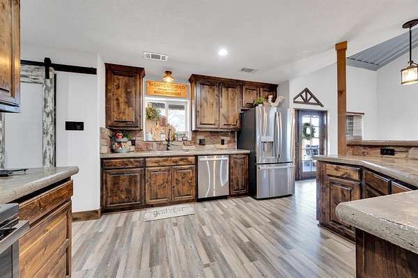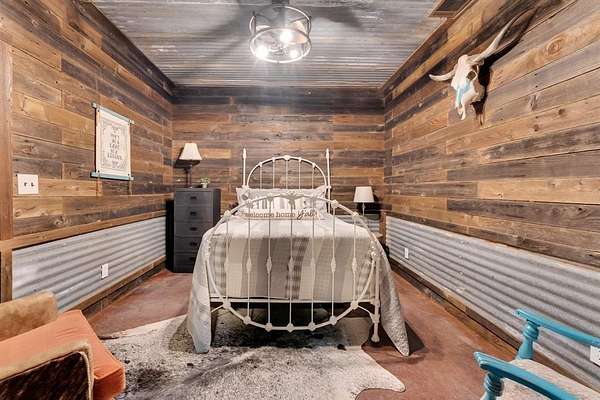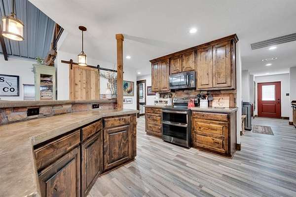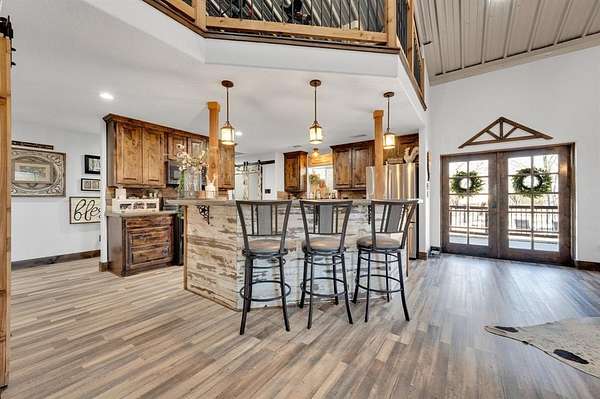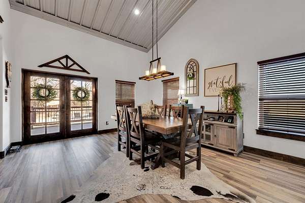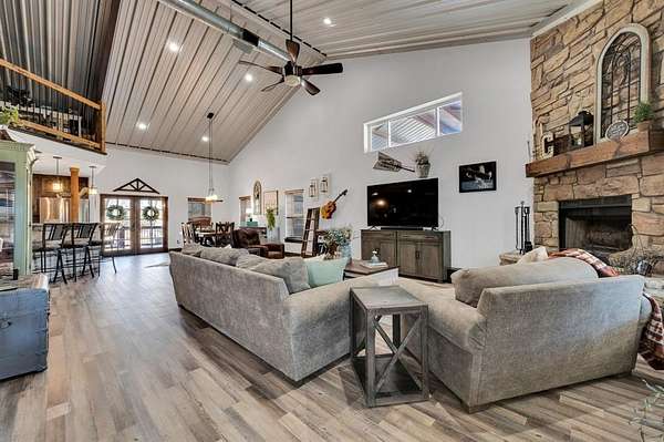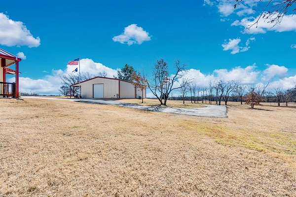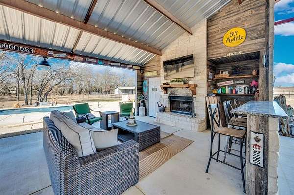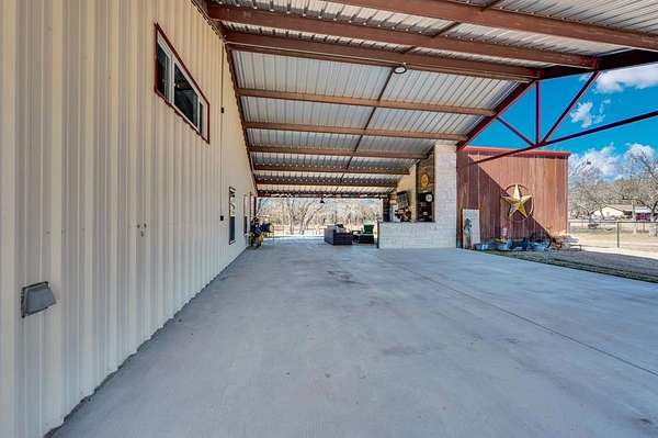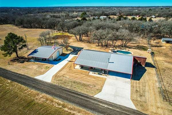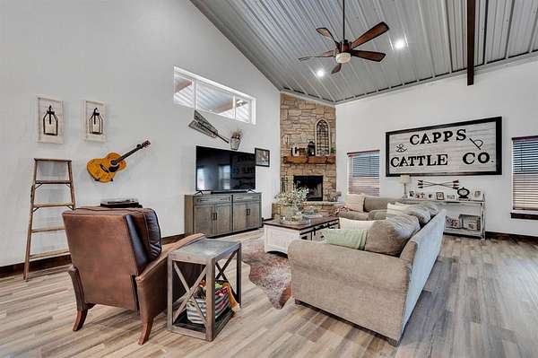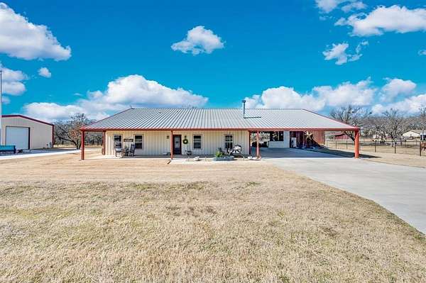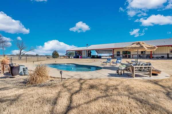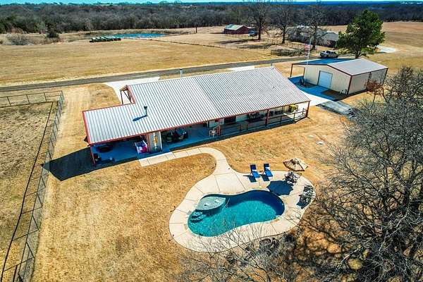 Discover country living at its finest with county taxes and highly sought-after Grandview ISD! This stunning property blends rustic charm with modern comfort, surrounded by mature trees, wide-open views, and peaceful privacy. The barndo-style home features expansive covered porches front and back, 3 bedrooms, 2.5 bathrooms, an office, dual living areas, and an open, airy floor plan. Inside, you'll find a perfect mix of warmth and sophistication with newly installed luxury vinyl flooring and large windows that frame beautiful rural scenery. Both indoor and outdoor stone fireplaces create inviting spaces to gather during cooler months. The kitchen offers both style and functionality with updated appliances, ample counter space, and custom cabinetry that enhances the home's rustic appeal. A 30x40 foam-insulated workshop adds tremendous value, complete with a 450 sq ft guest suite featuring a bedroom, living area, and full bath--ideal for visitors, multigenerational living, or rental potential. Step outside to enjoy a brand-new inground pool, a relaxing hot tub, and room to roam. The fenced area with a barn is perfect for a horse or FFA projects, adding to the property's versatility. With its serene setting and exceptional amenities, this property truly has it all!