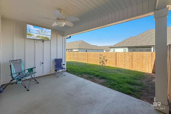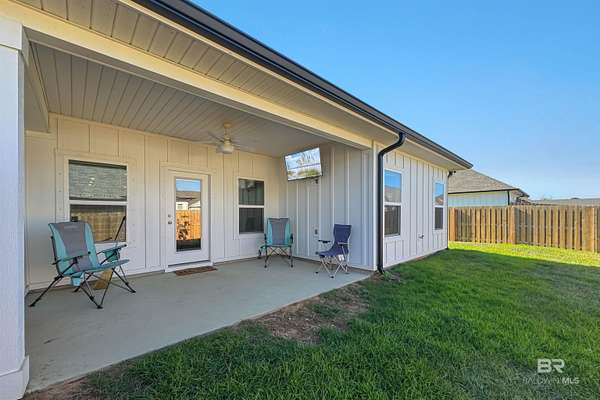 - Ceiling Fan(s), Covered Patio, Fenced, Porch-Back, Split Bedroom Plan, Window Treatments