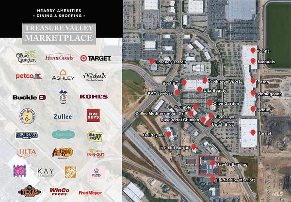 Hawks Landing Apartments is a fully stabilized complex centrally located in the Treasure Valley Marketplace, which presents an exceptional investment opportunity. This community features four buildings and three spacious floorplans with one, two, and three-bedroom options. Each unit is thoughtfully designed with modern finishes including quartz countertops, stainless steel appliances, abundant cabinet and pantry space, walk-in closets, and luxurious soaker tubs. Residents enjoy added conveniences such as in-unit laundry, covered parking, and pet-friendly living complete with a dog park. Outdoor amenities include a playground and landscaped common areas, fostering a welcoming environment for all lifestyles. Ideally located near the Treasure Valley Marketplace shopping plaza, Hawks Landing combines style, comfort, and accessibility.