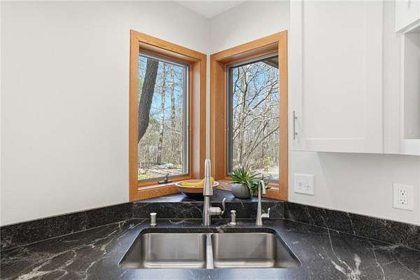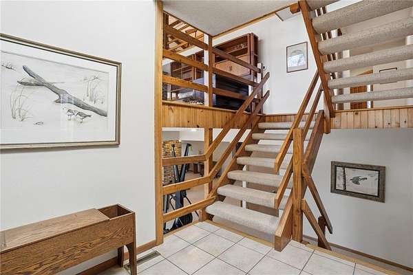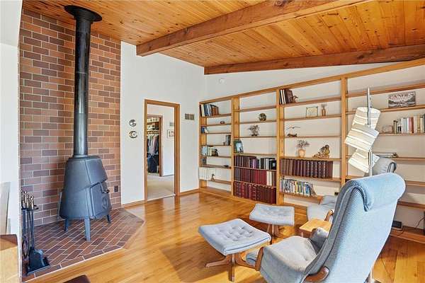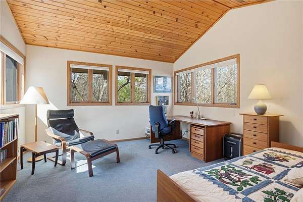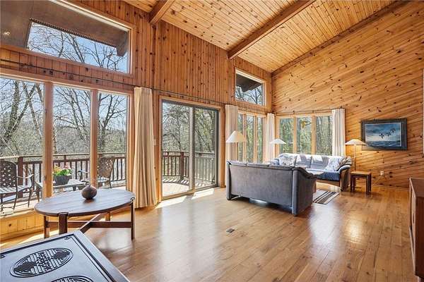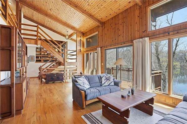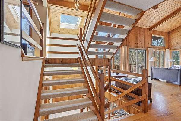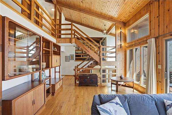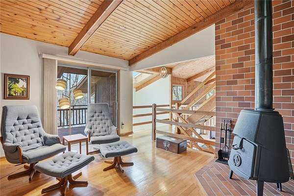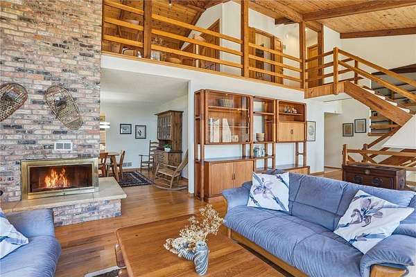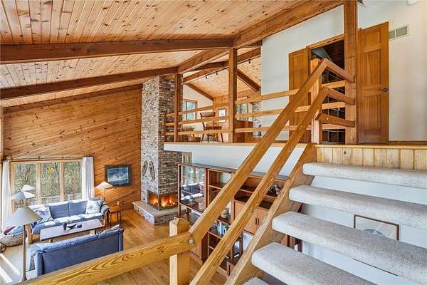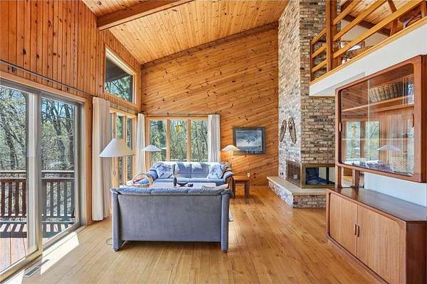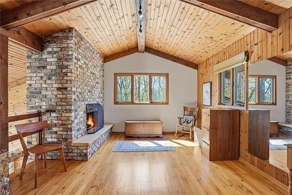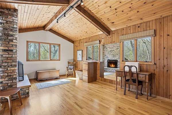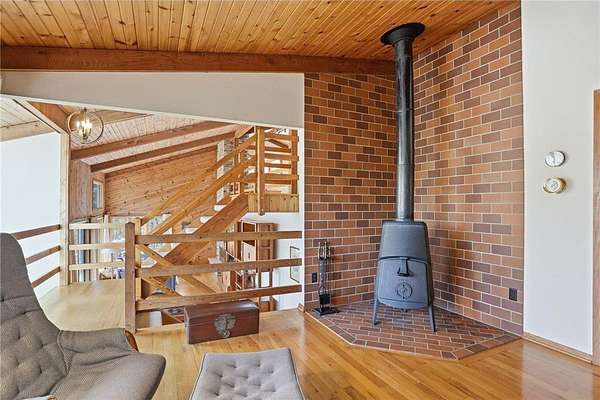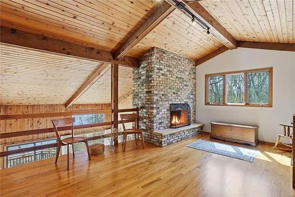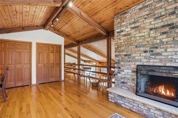 From the moment you arrive via the long, wooded driveway, you’ll feel a sense of escape. Inside, rich woodwork flows throughout the home, from the floors and trim to the custom railings, creating an inviting and cohesive design. A dramatic Chicago brick fireplace anchors the space, extending from the walk-out lower level to the soaring peak of the loft, adding both grandeur and comfort.