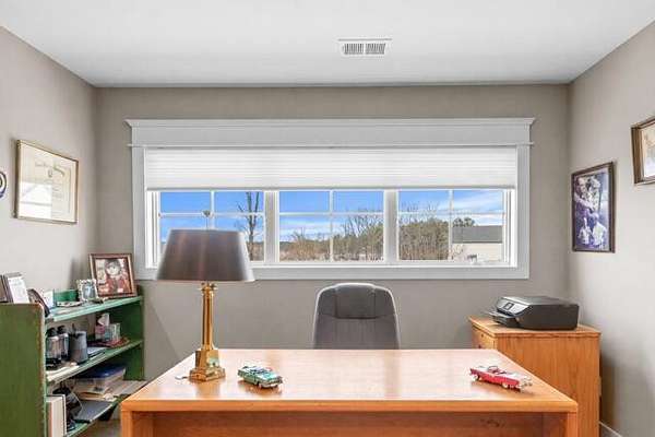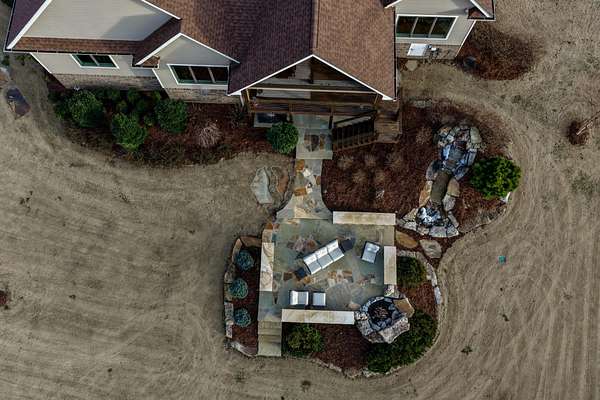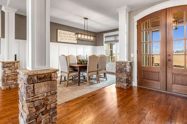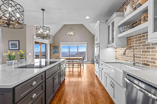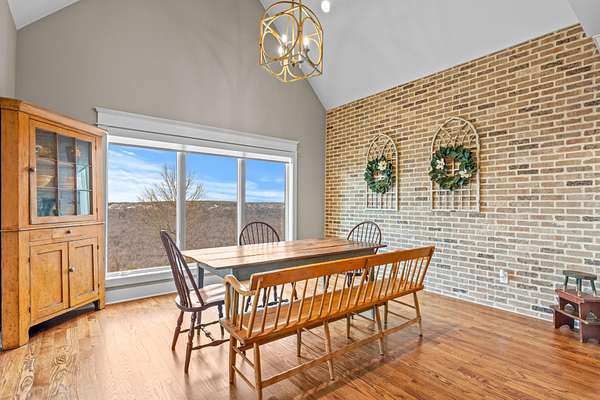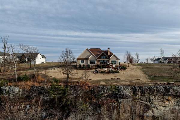 This thoughtfully designed home features 3 bedrooms, 2.5 baths, an additional upstairs loft space, and a spacious two-car garage. The versatile loft is ideal for a home office, media room, or guest retreat, adding flexibility to the open and inviting layout. The home offers three walk-in closets, one in each bedroom, providing generous storage and convenience throughout. Designed with both elegance and everyday living in mind, the Tuscan brick kitchen serves as the heart of the home, showcasing a wall oven, oversized island with quartz countertops, a separate pantry for added storage, and a charming breakfast room surrounded by floor-to-ceiling windows that frame the stunning bluff views. A separate dining room provides the perfect space for gatherings, while the vaulted ceiling in the living room creates an open, airy atmosphere anchored by a beautiful gas fireplace and enhanced by tasteful cosmetic columns that add architectural character. The home also offers a dedicated laundry room complete with built-in shelving for convenience and organization.