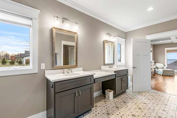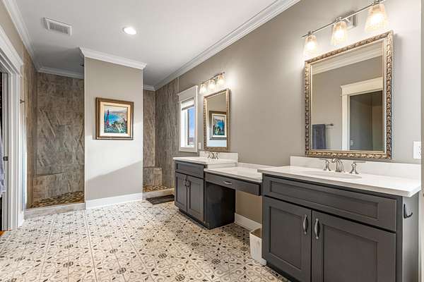 The primary suite is a true retreat, highlighted by floor-to-ceiling windows that flood the space with natural light and showcase the sweeping mountain views. The spa-inspired primary bath features a striking double-sided walk-in shower, offering both luxury and functionality in a beautifully designed space. Step directly from the living room onto the back deck, where vaulted hardwood ceilings and automatic-close outdoor blinds provide year-round comfort and privacy.