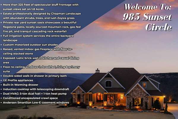 Perched along one of the most coveted bluff lines in Jasper Highlands, 985 Sunset Circle offers a rare opportunity to experience luxury mountain living on 1.8 private acres with over 325 feet of exceptional brow frontage on a quiet mountain peninsula. From this extraordinary vantage point, breathtaking panoramic views unfold across the Cumberland Plateau and deep into the Sequatchie Valley, creating a dramatic landscape of rolling mountains, expansive skies, and unforgettable sunsets. Uniquely positioned on the brow, the property enjoys both inspiring sunrises and spectacular sunsets, filling the home with ever-changing mountain light throughout the day. Thoughtfully designed to capture the scenery, inspiring mountain views are enjoyed from many of the home's primary living spaces, creating a constant connection to the surrounding landscape.