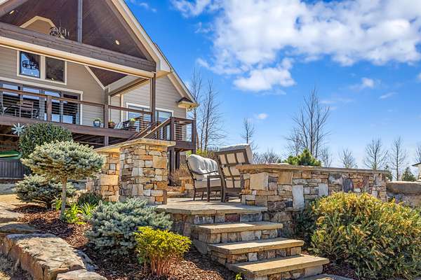 Below the deck, a beautifully crafted flagstone patio offers an inviting outdoor retreat surrounded by the natural beauty of the bluff and enhanced by thoughtfully designed mature landscaping that complements the natural mountain setting. A dramatic gas fire pit crafted from locally sourced mountain rock creates the perfect setting for evening gatherings beneath the stars, while a custom cascading waterfall feature provides a striking natural centerpiece, its gentle flow adding a soothing soundtrack to this tranquil out