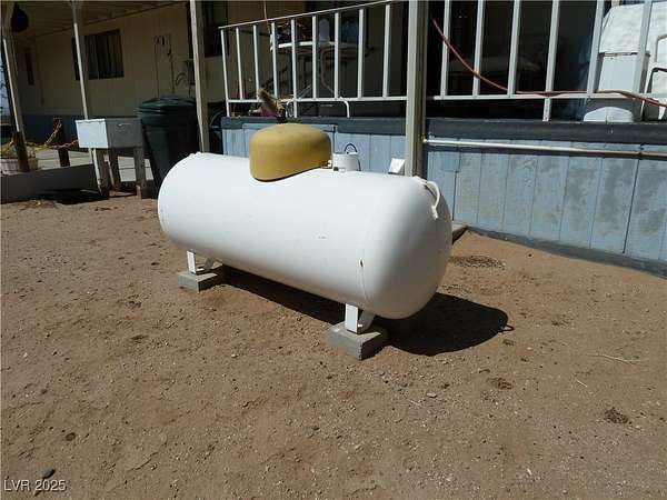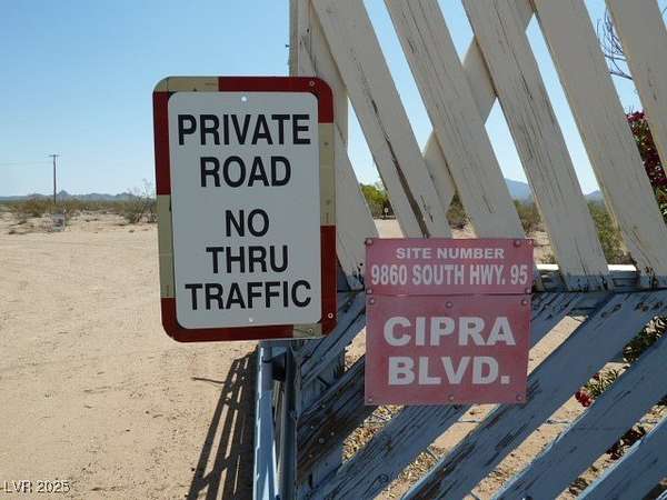 From Searchlight, head S on US 95 to Cal Nev Ari. Property on the Left at the south end of town, bordered by shrubs.
