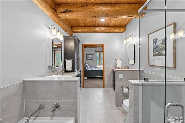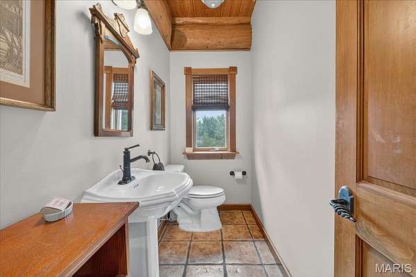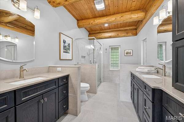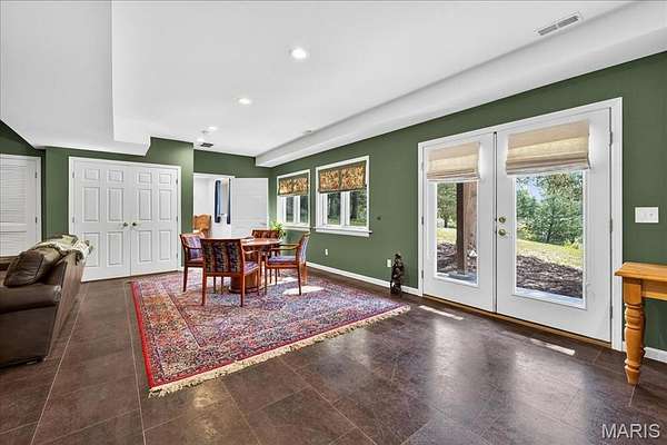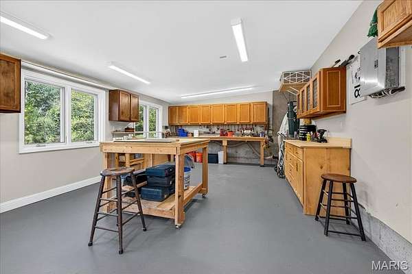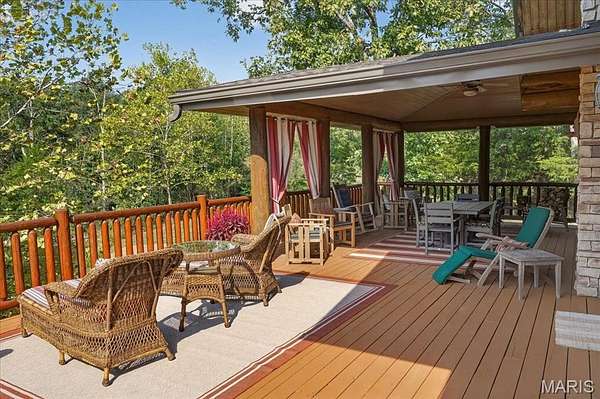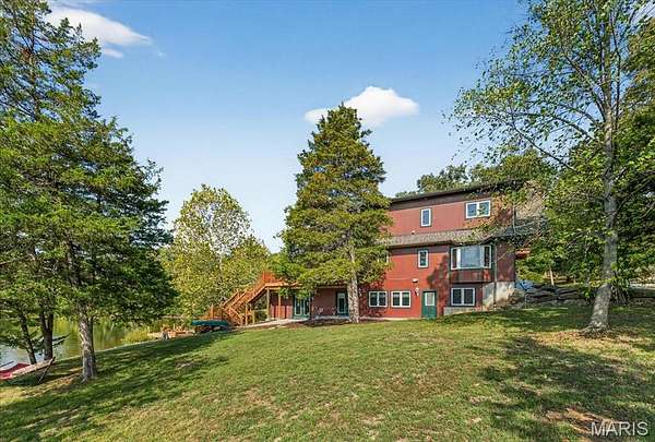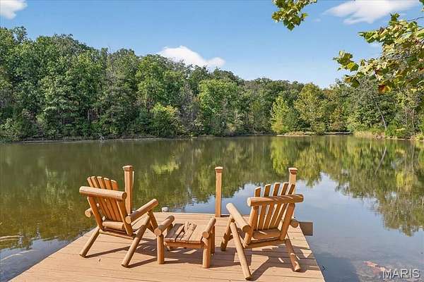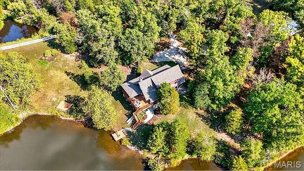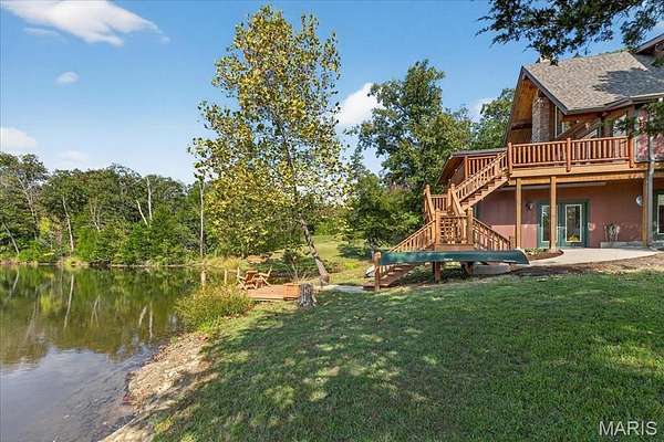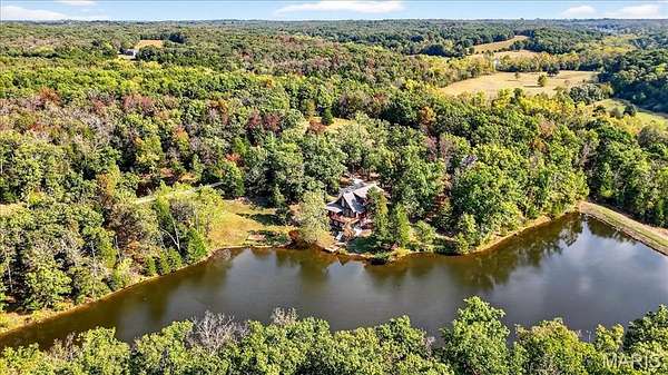 At the end of a quiet drive—just beyond the flurry of St. Louis—a story begins to unfold. Set across 40 acres of unspoiled landscape, this remarkable log home offers more than a residence; it is a way of life defined by calm, connection, and natural beauty. As you arrive, the land opens gently to reveal a private 5-acre lake, its still waters reflecting the surrounding woods and sky. The home is thoughtfully positioned to take full advantage of these views, with a lakeside dock and patio inviting slow mornings, quiet afternoons, and evenings spent watching the light fade across the water. Inside, the great room immediately draws you in—a soaring space framed by warm knotty pine ceilings and anchored by a striking 21-foot stone fireplace. Morning begins in the kitchen, where sunlight filters through the trees and settles across warm wood cabinetry. Coffee lingers a little longer here with flowing conversations around the central island as the day gently takes shape. From there, the home opens effortlessly between the kitchen, dining, and living spaces, where the atmosphere remains deeply inviting.?? A haven for relaxation, the main-level primary suite showcases a beautifully renovated bath with dual vanities, a linen closet, soaking tub, and an expansive shower, while a generously sized walk-in closet completes the space, offering everyday convenience. The upper level features a lofted area—ideal for casual games or a quiet reading nook—as well as two bedrooms that share a bath and a balcony with scenic views of the property. The walk-out lower level extends the home’s versatility, with a fourth bedroom, full bath, recreation space, laundry, substantial storage, and a dedicated workshop—ideal for hobbies or projects. Outdoors, a wraparound covered porch, expansive deck, and shaded patio create cohesive spaces to gather, entertain, or simply take in the quiet beauty of the setting. A second pond, along with a metal barn and additional lean-to, enhances the property’s functionality for equipment, animals, or activities. Meticulously maintained and smartly equipped with geothermal heating and cooling, a whole-house water softener, central vacuum, and camera-monitored security, the home balances rustic character with modern convenience. Accessed by a well-kept private road and located just over an hour from St. Louis, this is more than a getaway—it’s a place to slow down, reconnect, and experience the beauty of each season in a setting that feels worlds away.
