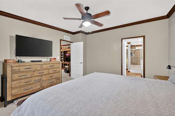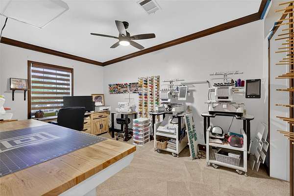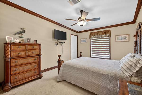 - Ceiling Fans(s), Crown Molding, Eat-In Kitchen, High Ceilings, Open Floorplan, Split Bedroom, Thermostat, Walk-In Closet(s), Window Treatments