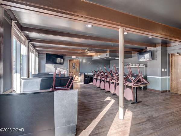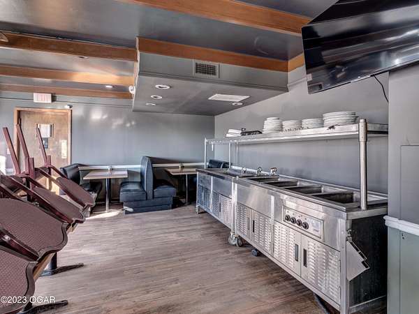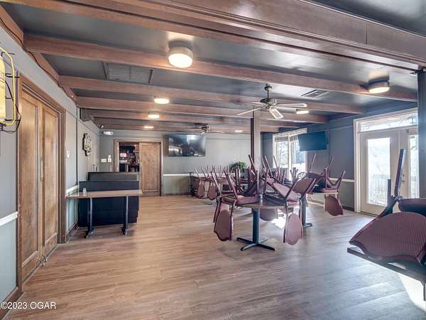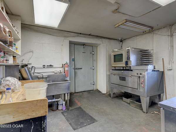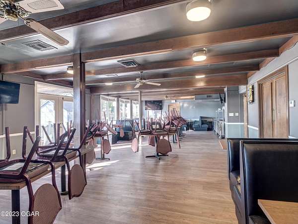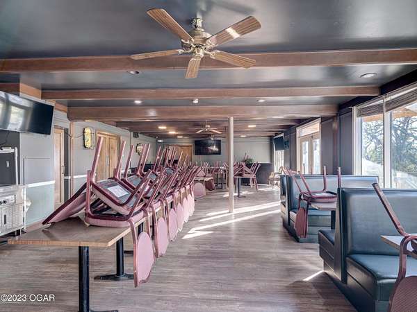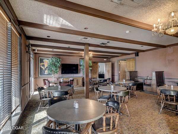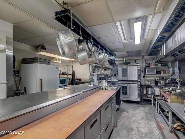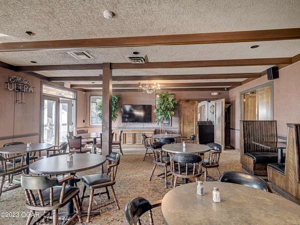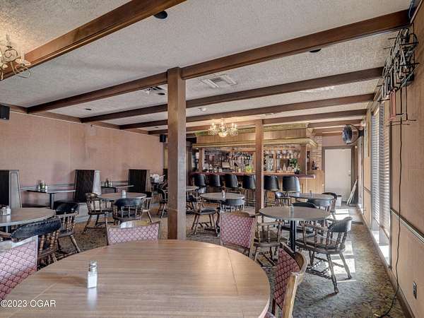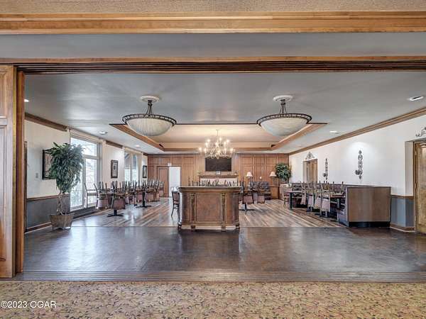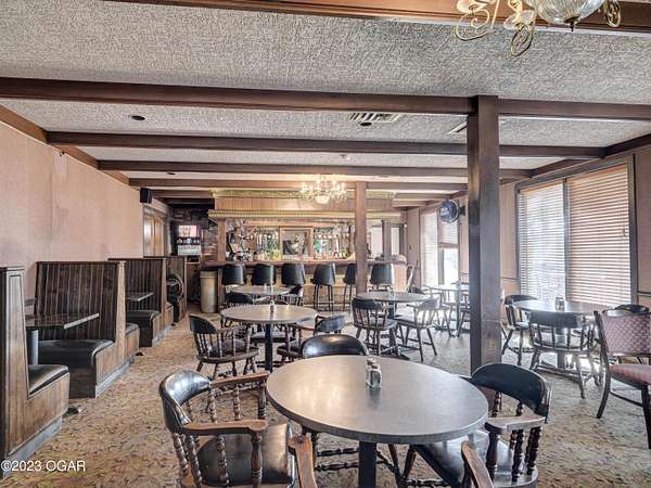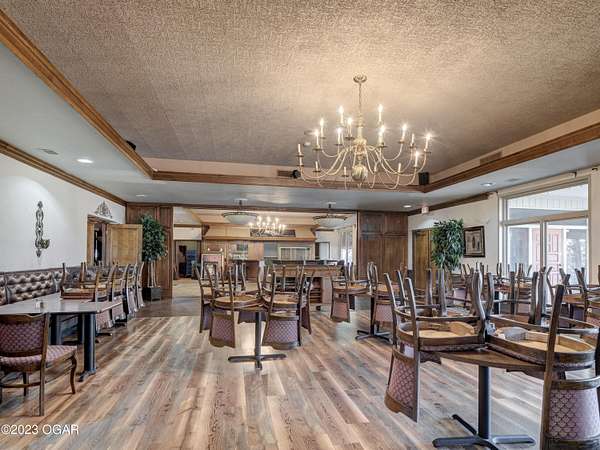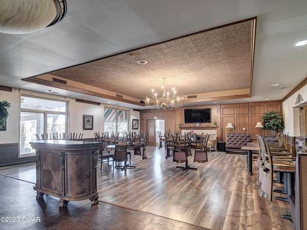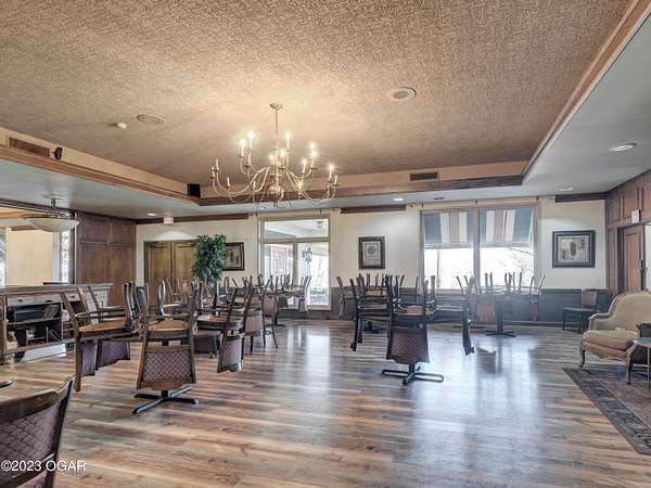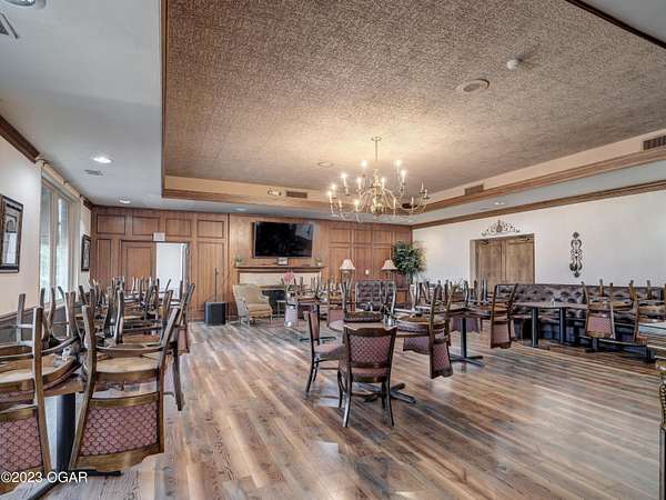 Restaurant opportunity in Carthage overlooking the scenic Carthage Municipal Golf Course. This property is turn-key and all you need to do is stock the large walk-in cooler and freezer! Beautiful Carthage stone exterior with a drive under portico opens into the foyer. Inside find a large central dining area, another serving area with a beautiful marble bar, a private lounge area, and a second private dining area. There is a large kitchen with everything you need to for serving large groups or catering. There are three bathrooms for guests with multiple stalls and two have showers. Unfinished basement with lots of storage. Upstairs there is a private office or living quarters. The very large parking area has just been resealed, and existing tennis courts.