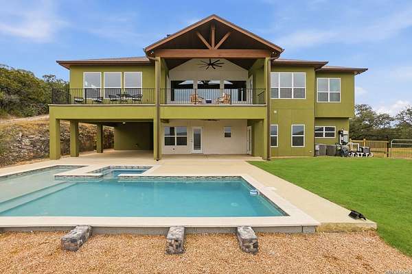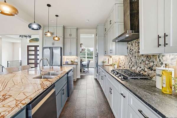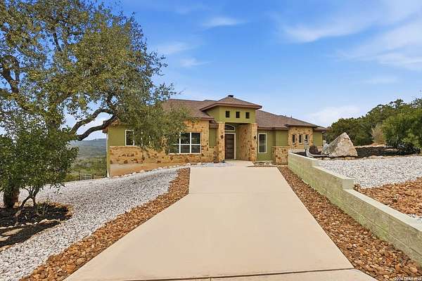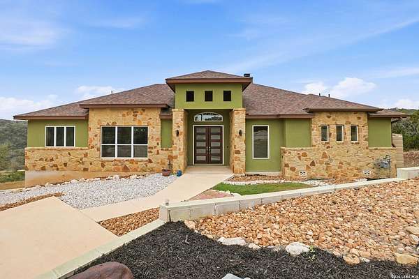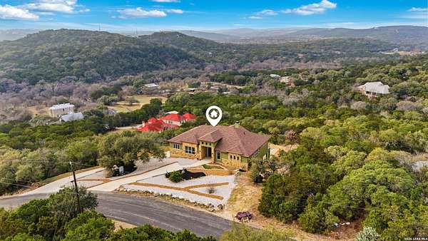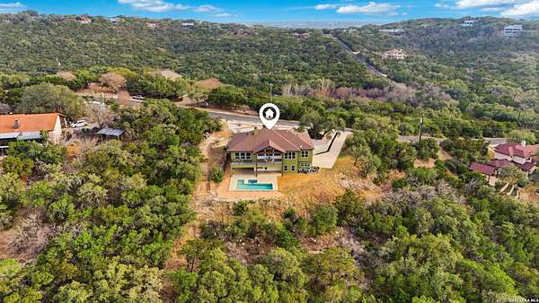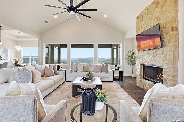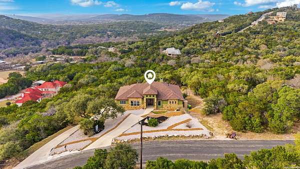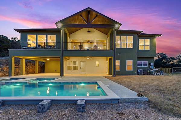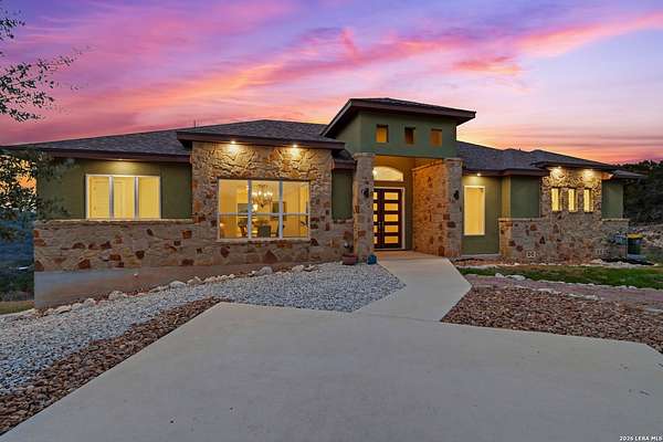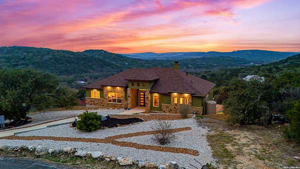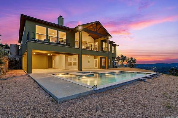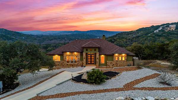 Perched high above the Texas Hill Country, this breathtaking custom estate delivers panoramic sunset views, refined finishes, and exceptional indoor-outdoor living. From the moment you arrive, the striking stone facade, modern double front doors, and expansive hilltop setting set the tone for what awaits inside. The main level showcases an open-concept design anchored by a dramatic floor-to-ceiling stone fireplace and soaring ceilings. Walls of windows frame sweeping views and fill the home with natural light. The chef's kitchen is a true showpiece featuring custom cabinetry, designer pendant lighting, a statement stone backsplash, gas cooktop, built-in appliances, and an oversized island with abundant seating. A spacious dining area and breakfast nook flow seamlessly for everyday living or hosting guests. The private primary suite is a luxurious retreat with serene views, spa-inspired bath, soaking tub, walk-in shower, dual vanities, and generous closet space. Secondary bedrooms are well-appointed and thoughtfully positioned for comfort and privacy. Downstairs offers additional living space ideal for a game room, guest quarters, or multi-generational living, with direct access to the expansive covered patio. Step outside to your resort-style backyard complete with a stunning pool and spa. Whether enjoying morning coffee or unforgettable Texas sunsets, this property offers the ultimate private escape. A rare opportunity to own a beautifully designed hilltop retreat with luxury finishes, flexible living space, and spectacular views-this is Texas living at its finest!
