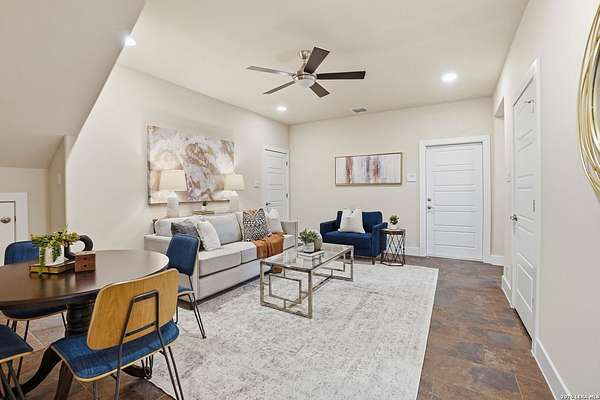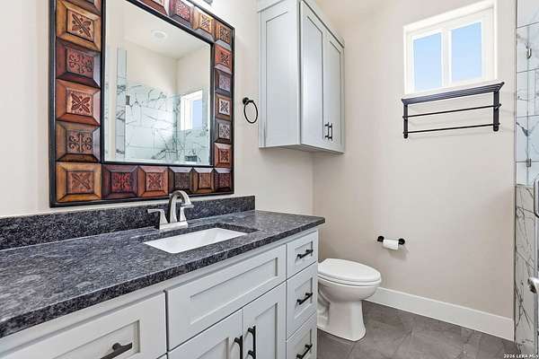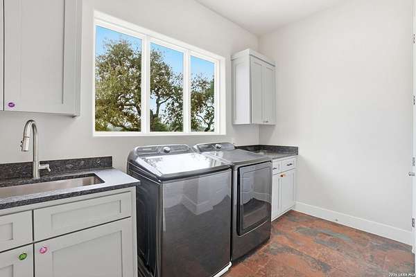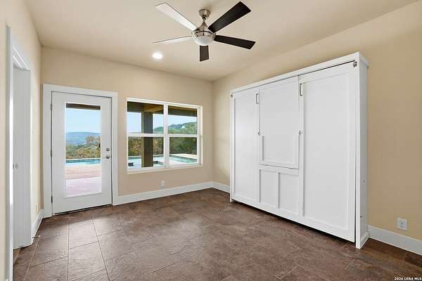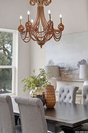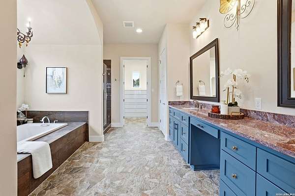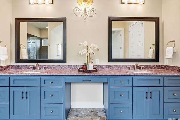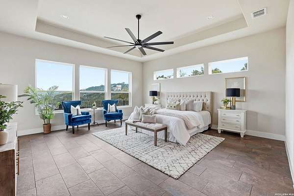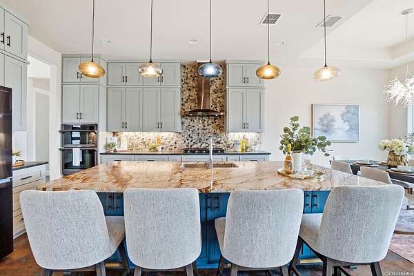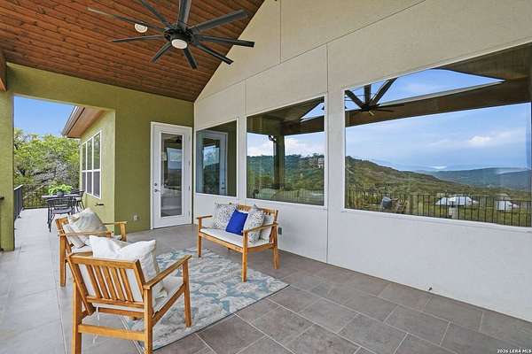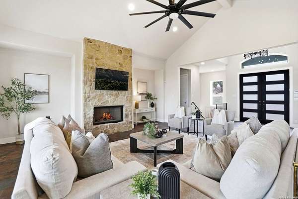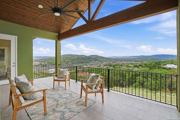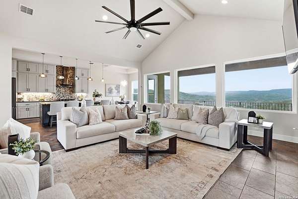 Perched high above the Texas Hill Country, this breathtaking custom estate delivers panoramic sunset views, refined finishes, and exceptional indoor-outdoor living. From the moment you arrive, the striking stone facade, modern double front doors, and expansive hilltop setting set the tone for what awaits inside. The main level showcases an open-concept design anchored by a dramatic floor-to-ceiling stone fireplace and soaring ceilings. Walls of windows frame sweeping views and fill the home with natural light. The chef's kitchen is a true showpiece featuring custom cabinetry, designer pendant lighting, a statement stone backsplash, gas cooktop, built-in appliances, and an oversized island with abundant seating. A spacious dining area and breakfast nook flow seamlessly for everyday living or hosting guests. The private primary suite is a luxurious retreat with serene views, spa-inspired bath, soaking tub, walk-in shower, dual vanities, and generous closet space. Secondary bedrooms are well-appointed and thoughtfully positioned for comfort and privacy. Downstairs offers additional living space ideal for a game room, guest quarters, or multi-generational living, with direct access to the expansive covered patio. Step outside to your resort-style backyard complete with a stunning pool and spa. Whether enjoying morning coffee or unforgettable Texas sunsets, this property offers the ultimate private escape. A rare opportunity to own a beautifully designed hilltop retreat with luxury finishes, flexible living space, and spectacular views-this is Texas living at its finest!