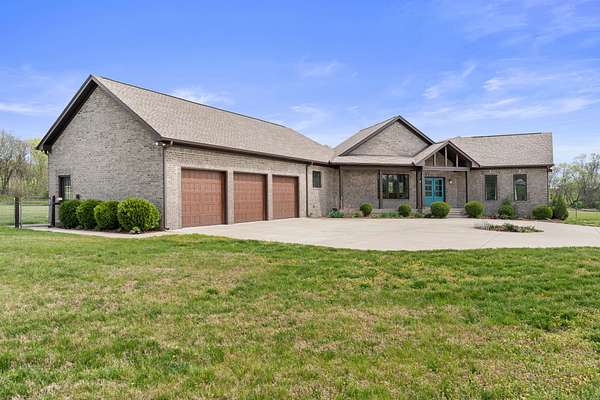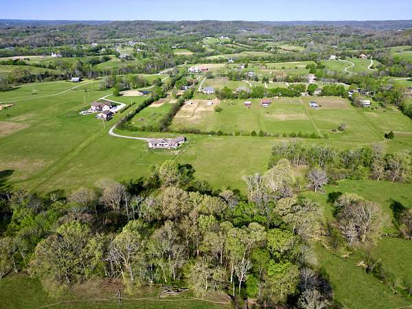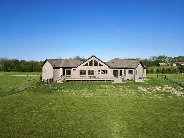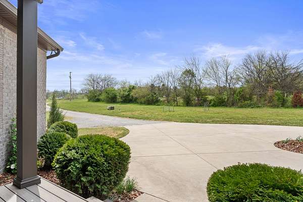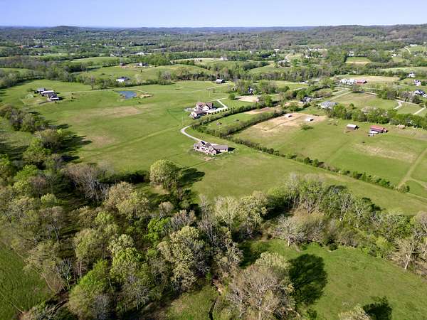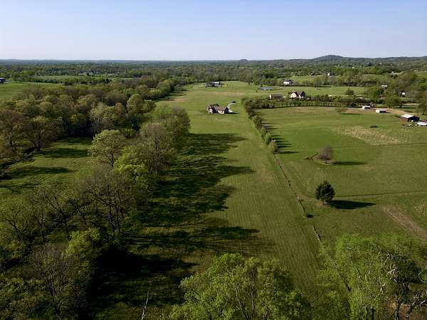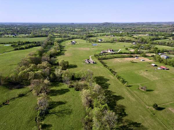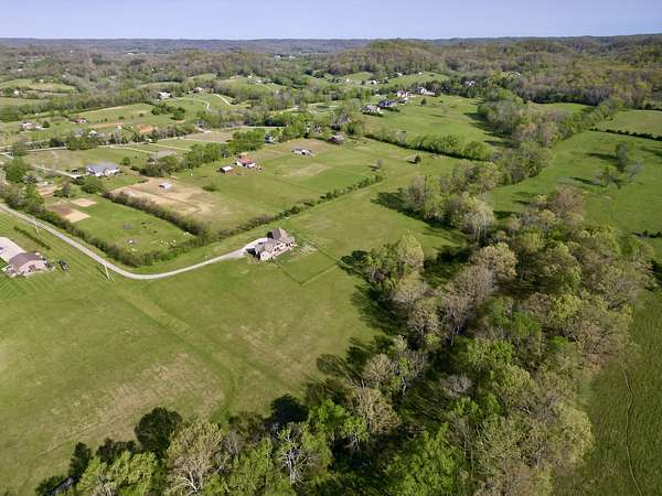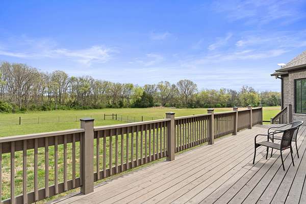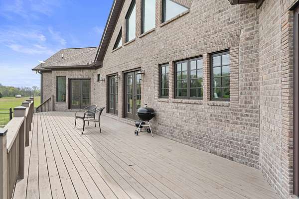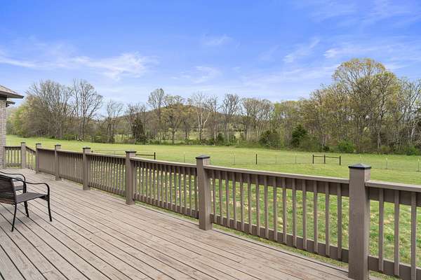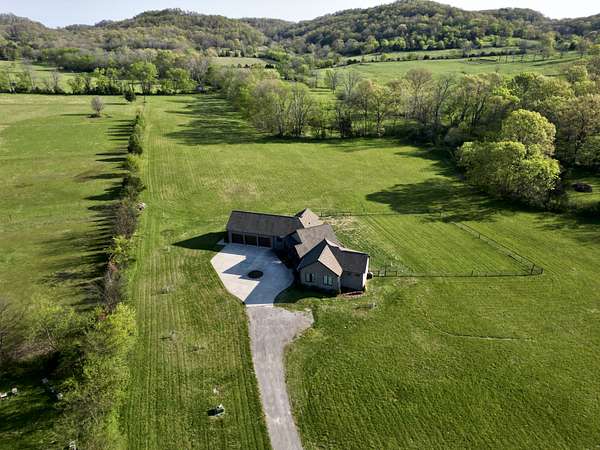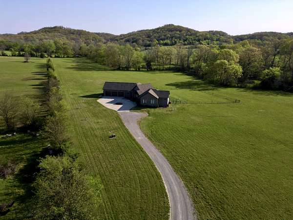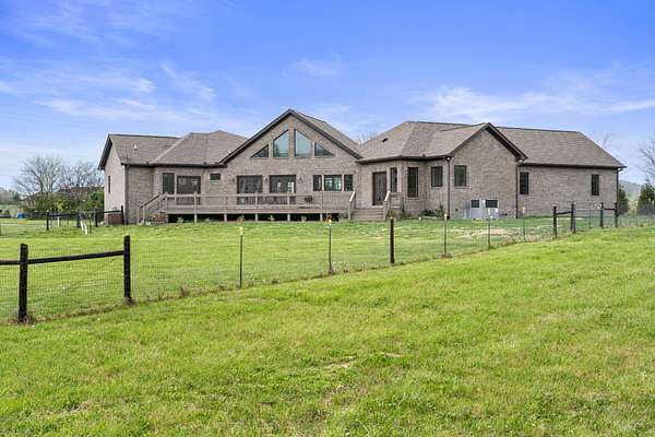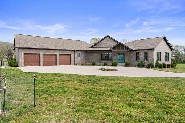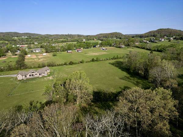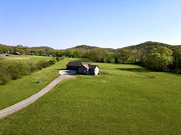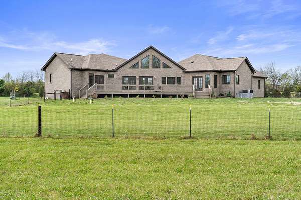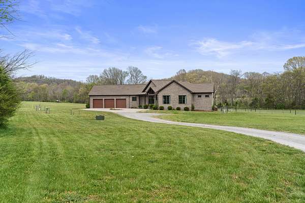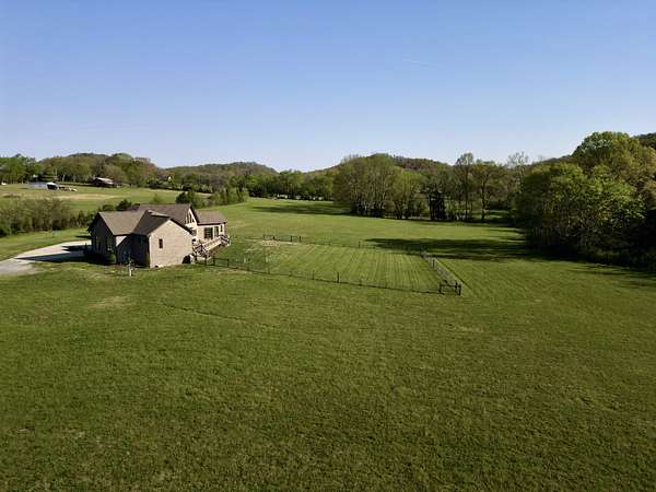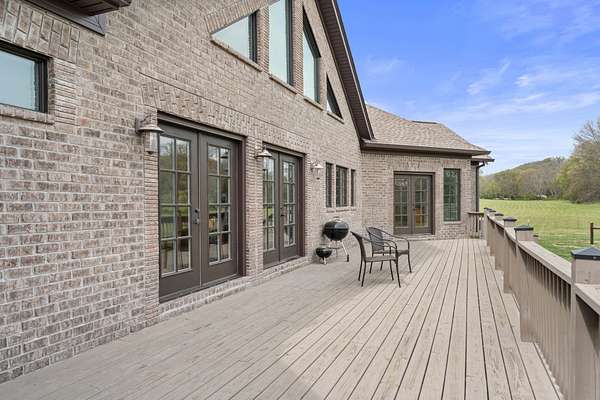 Tucked behind a long private drive on 14± acres of rolling Sumner County countryside, this custom brick home delivers the privacy, land, and quality that are increasingly hard to find this close to Gallatin's amenities. The property features open pasture, established fencing, and a creek along the edge — ready for horses, livestock, or a hobby farm — all framed by wooded ridgelines and long pastoral views from the rear deck. Inside, the soaring shiplap cathedral ceiling anchors a grand open great room and kitchen that few custom builds in this price range can match. Wide-plank hardwood floors, clerestory windows flooding the space with natural light from above, a wood-burning fireplace flanked by built-in cabinetry, and French doors opening to the oversized rear deck make this a space built for both everyday living and large-scale entertaining. The kitchen is a serious cook's environment — custom white oak cabinetry, professional BlueStar range, designer range hood, farmhouse sink with pasture views, quartz countertops, butcher block prep island, and a large walk-in pantry. The primary suite is privately situated with direct deck access and open field views, and features a spa-quality ensuite with double vanity, quartz counters, and an oversized tile shower with frameless glass enclosure. An additional en-suite bedroom, a generously sized flex room with fourth bedroom potential, a dedicated laundry room with utility sink and full cabinetry, and an enlarged two-car garage complete the thoughtful one-level floorplan. Zoned for Liberty Creek Schools — one of Sumner County's most sought-after school assignments. Whether your vision is a private retreat, a working hobby farm, or simply a custom home with room to breathe, 989 Franklin Road checks every box without compromise. The home's east-to-west orientation maximizes natural light throughout the day, and the rear deck's sweeping pasture and tree line views remind you at every turn exactly why you chose this property.