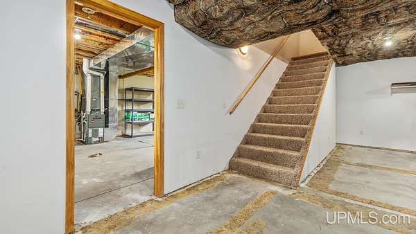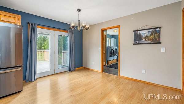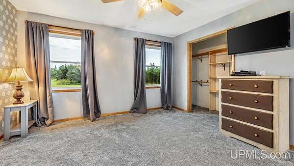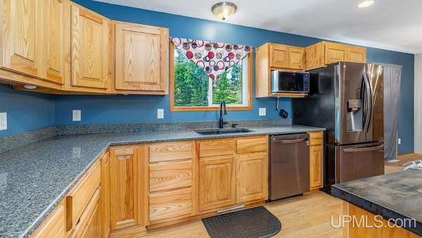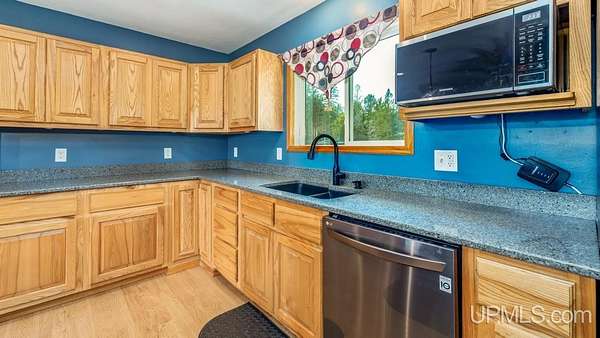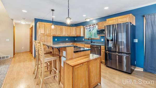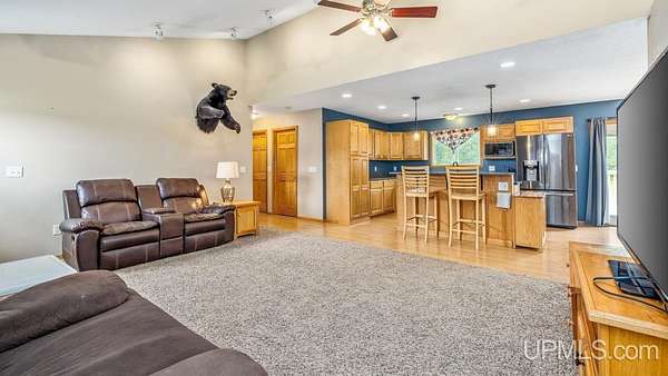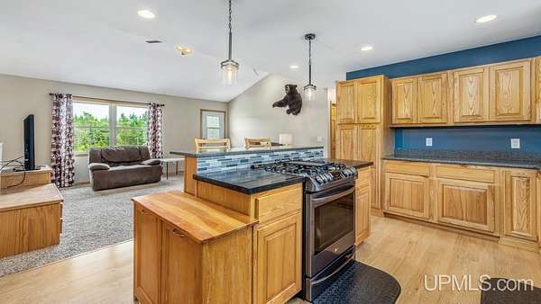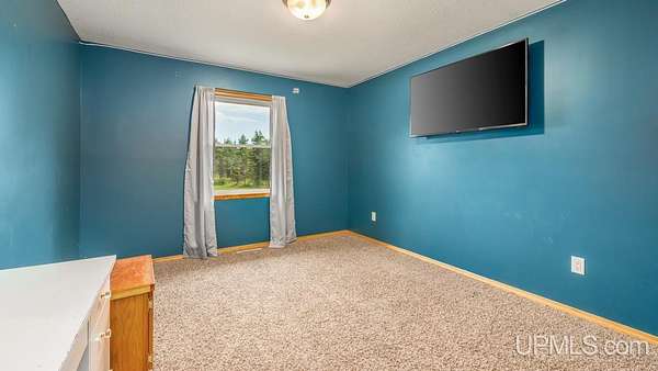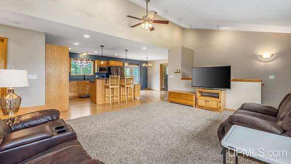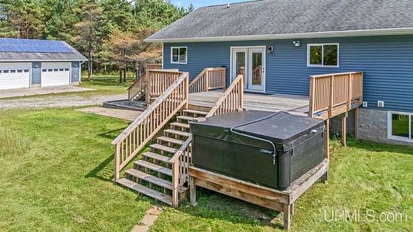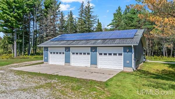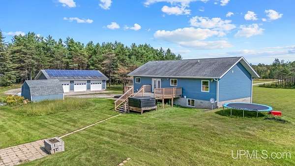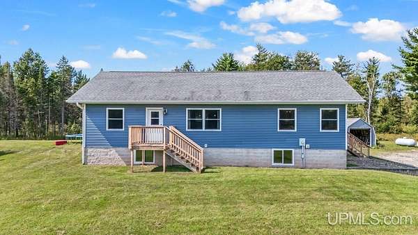 Beautiful, Quiet, and Serene--A True Countryside Retreat Nestled on just over ten acres in Ensign Township, Rapid River, this picturesque property offers tranquility, privacy, and space to roam. The raised ranch-style home, built in 2009, features modern amenities throughout--including central air conditioning and an energy-efficient solar power system that's integrated into the grid. The main level offers 1,456 square feet of comfortable living space in a desirable split-bedroom layout, providing privacy with two bedrooms and a shared bathroom on one side, and a spacious primary suite on the other. The primary suite includes a well-appointed bathroom with a custom-tiled walk-in shower and an expansive quartz vanity. The heart of the home is the open-concept kitchen, dining, and living area--perfect for everyday living or entertaining. The kitchen boasts quartz countertops, a smart layout, and newer stainless steel appliances. Convenient main-floor laundry adds to the home's functionality. The full basement offers exciting potential for additional living space, with four egress windows already in place for future bedrooms or recreational rooms. Outside, a 42x28 finished detached garage provides ample room for vehicles, tools, and toys, while a 42x10 lean-to off the back offers extra sheltered storage. Two ponds enhance the peaceful setting, creating a haven for nature lovers and outdoor enthusiasts. Whether you're seeking a homestead, a private escape, or a base for adventure, this property delivers the perfect blend of comfort, efficiency, and natural beauty.