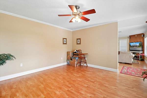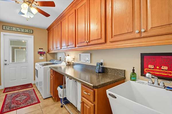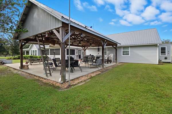The large primary suite is on the first level and has oversized his and hers walk-in closets along with dual sinks, soaking tub and large walk-in shower. There are additional storage and closet areas at the back of the primary bathroom. There is also a second bedroom and full bathroom on the first level, separate from the half bath under staircase adjacent to the family room. Up the staircase, which divides the private second living area from the open concept family/dining/kitchen area, you will find two additional oversized bedrooms and bathrooms, each with walk in closets. For easy maintenance, the entire house is laminate or tile flooring and has been meticulously maintained. This home was designed for farm life functionality with an excellent balance of storage and living space in this home. The large laundry room accesses the outdoors. The spacious laundry has a sink and folding counter. This laundry room has a large sink and folding counter, and also has two storage closets. As you step out onto the concrete area with large covered pavilion, this is an amazing space for entertaining and family memories. A detached three car garage is also accessed from the laundry room via a short, covered walkway for convenient access.