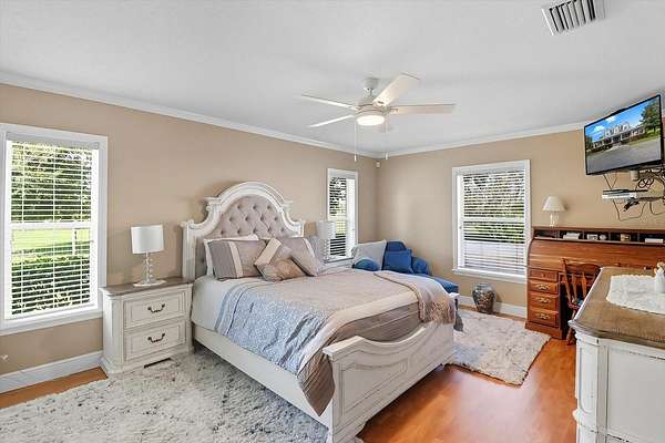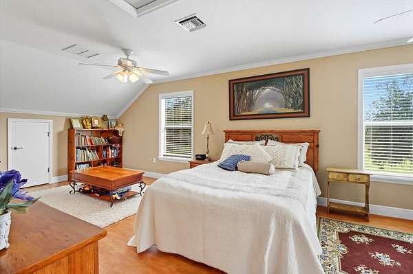 The acreage is open, but dotted with oak trees, and was previously used horses and cattle. The pastures have been kept in pristine condition with regular fertilizer and pesticide treatments. There are presently four pastures, which could be further divided and a pond that is stocked with catfish and has a comfortable fishing pier. There are two equipment and tool sheds, along with a large 6 bay pole barn, which could be converted to a horse barn; however, the layout of this farm allows plenty of room to add your dream horse barn and arena. The possibilities for this property are endless with ample acreage for cattle, horse training or breeding and a large, comfortable updated move in ready home in such a coveted area of NW Ocala.