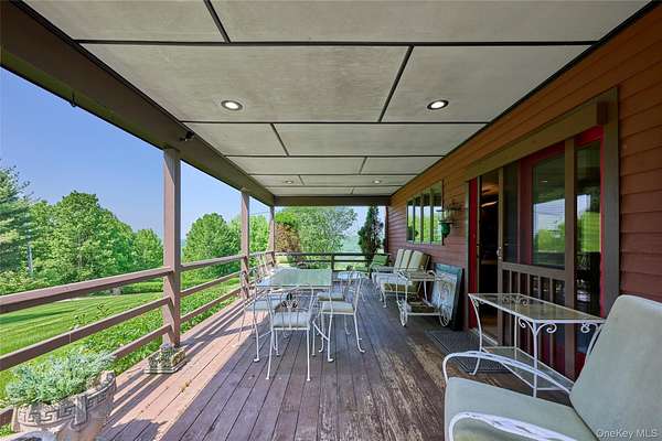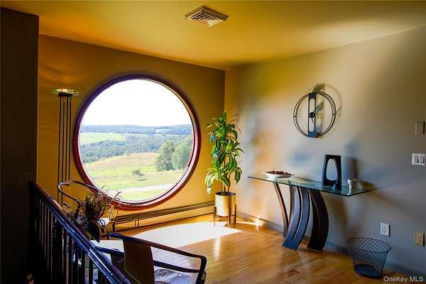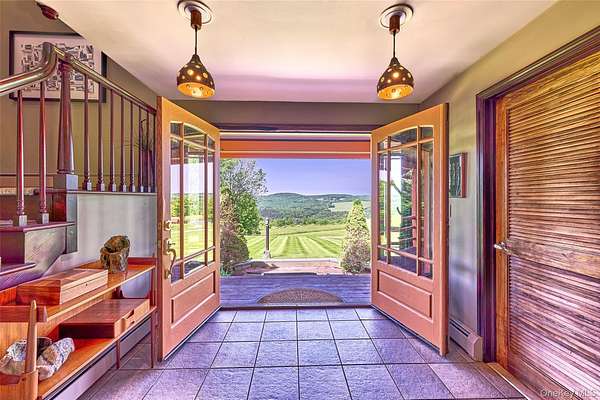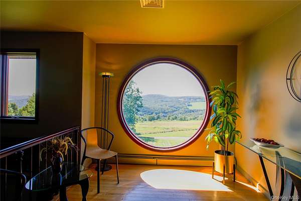This mountaintop contemporary sits on 15 private acres with unparalleled views of the western Catskills, miles of hills and valleys, and an expansive, rolling lawn.