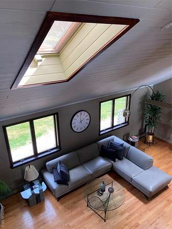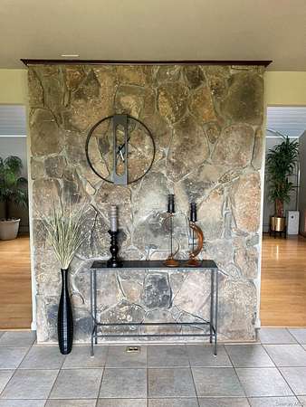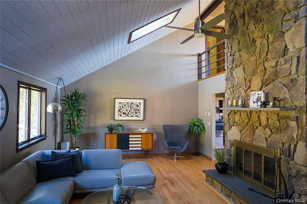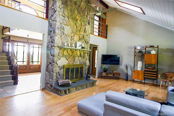 There are hardwood floors in beautiful condition on both the first and second floors. The first floor features an inviting foyer, half bath, and a spacious living room with a soaring vaulted ceiling and a floor-to-ceiling stone fireplace.