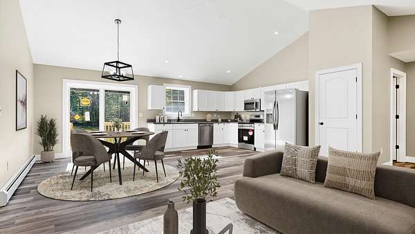Est $3,231/moDeeded ROW on Horne Pond ( AKA Pequawket Lake)Completed NEW construction! Beautiful Open Concept Kit/LR/DR W/Cathedral ceilings. Back deck slider allows sunlight to pour through the home. Features include Granite counter tops, SS appliances, Shaker Style white kitchen cabinets, Vinyl laminate plank floors throughout, semi-enclosed front porch, primary bedroom w/bath. Full basement. Seller concessions offered. Kit/DR/LR pictures are virtually staged.