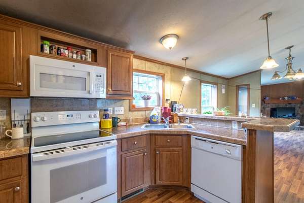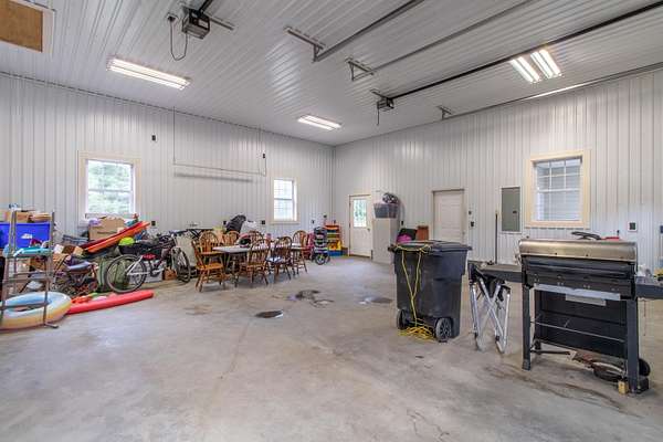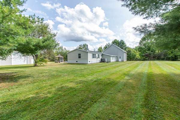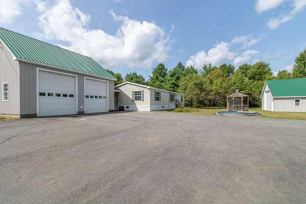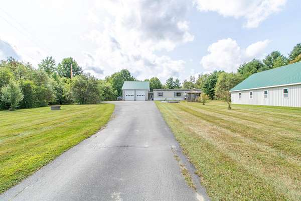 This remarkable property spans 47 acres, offering plenty of privacy with a mix of open space and wooded trails. The modern ranch-style home features two bedrooms, two full bathrooms, an open kitchen and dining area, a cozy den complete with a fireplace, and a living room boasting a cathedral ceiling. The home is built on a concrete slab with secure tie-downs. A paved driveway leads to an oversized 30x30 two-car garage, along with a spacious 30x48 garage for RV storage, equipped with two 14x14 overhead doors for easy access. Additional amenities include a generator hook-up and central air conditioning. Conveniently located just 2 miles from Exit 26 off I-91, this property is only 30 minutes from Jay Peak and Burke Mountain Resorts, and is also close to fishing spots along the Willoughby and Barton Rivers, as well as VAST snowmobile trails, and VASA trails on town roads.