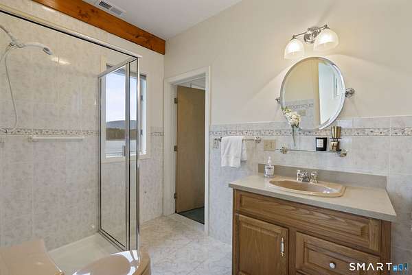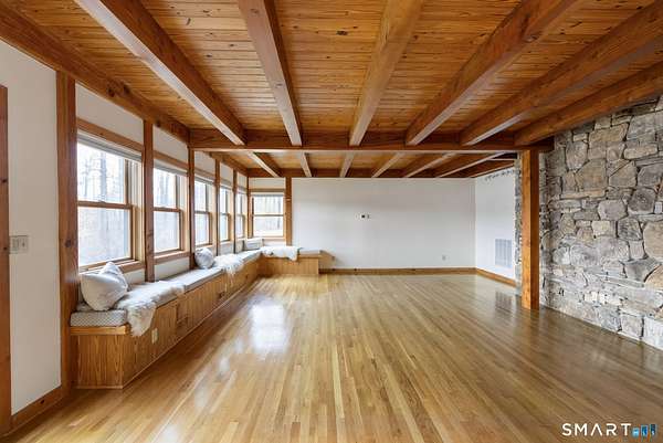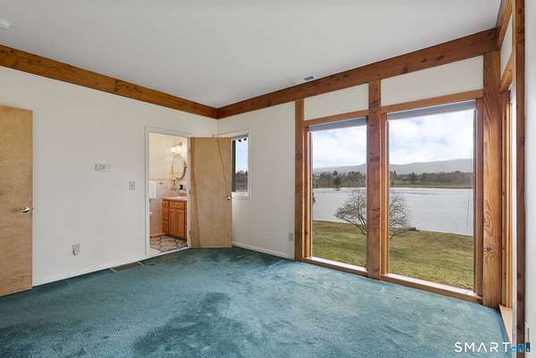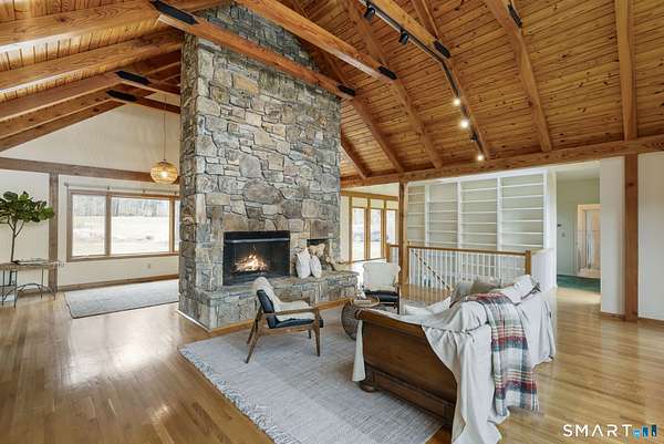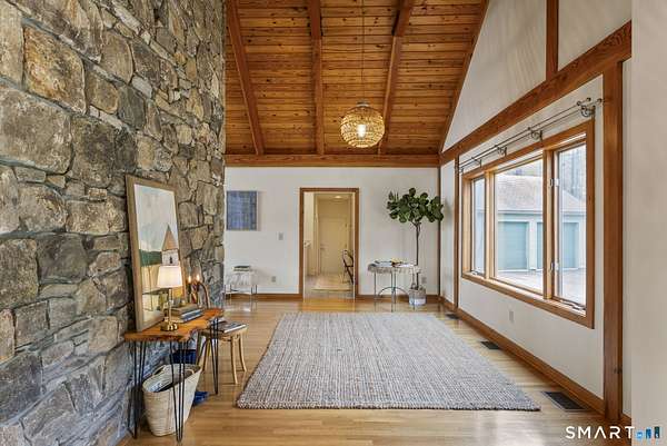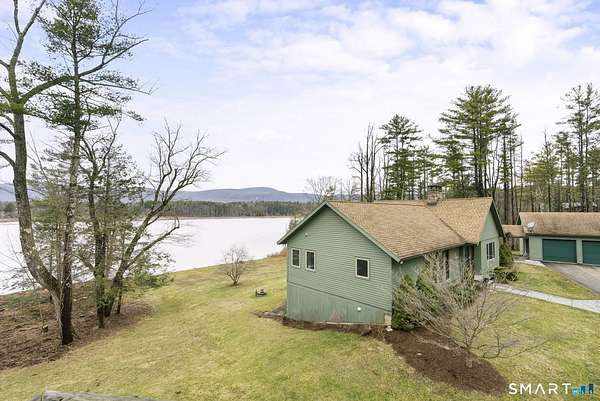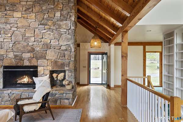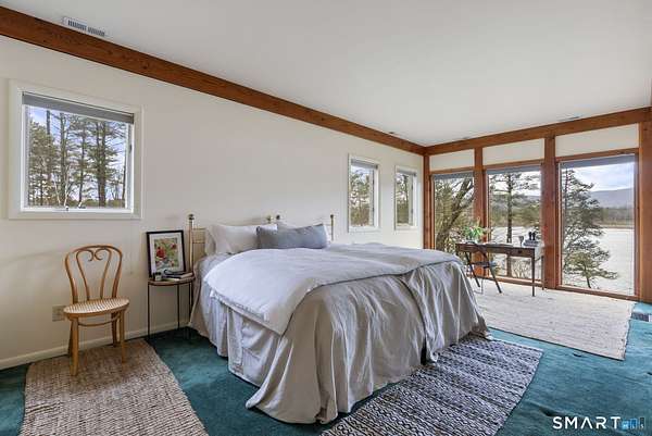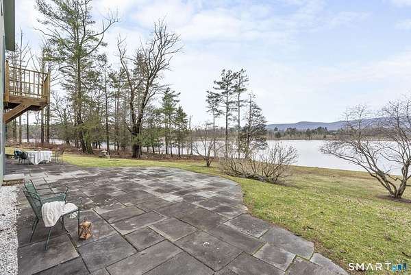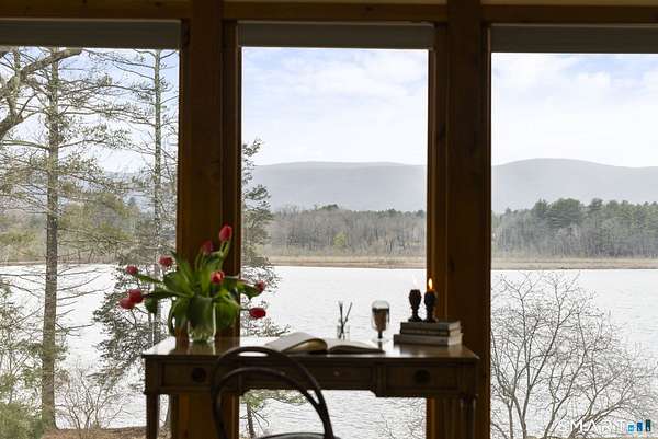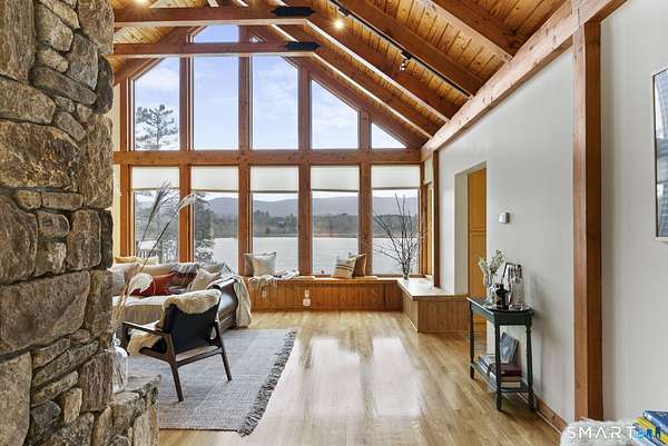 Arrive at The Lake House and a profound sense of peace immediately washes over you. Situated on a quiet, exclusive street along the shores of Lake Washinee in Salisbury , this contemporary estate offers a truly private retreat. With 300 feet (+/-)of pristine water frontage, the property looks out over the quiet lake to the Taconic Range, offering spectacular, western-facing sunset views. It is a setting so serene that graceful swans are frequently seen gliding across the water, while the neighborhood itself remains incredibly peaceful, disturbed only by the occasional resident walking their dog. Inside, a dramatic entrance welcomes you into a breathtaking foyer that flows into an awe-inspiring living room. Built in 2003, the home's soaring post-and-beam architecture beautifully weaves the natural outside world into the interior. Natural light streams through an expansive wall of glass, illuminating the hardwood floors and built-in window seats. The perfect spot to settle in with a book on an autumn afternoon. A stone woodburning fireplace anchors the space, promising cozy winter evenings. This spectacular room transitions seamlessly into a formal dining room with high ceilings, and an expansive kitchen designed to maximize the sweeping views of the lake and mountain range. The main floor was thoughtfully designed to capture lake views from almost every room.