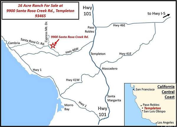 From Hwy 46 West, go north on Santa Rosa Creek Rd. to just before Cypress Mt. Dr. - property on north side of road.