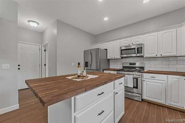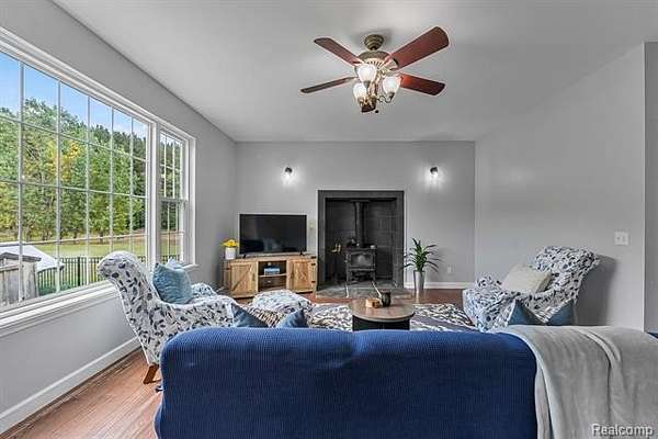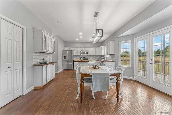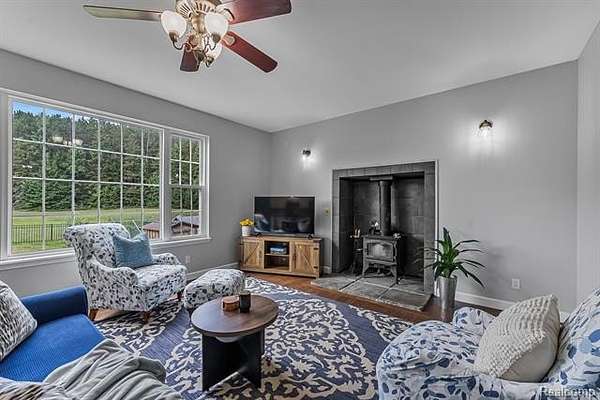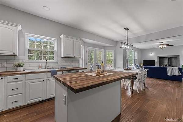 Step inside this bright, open-concept home with engineered hardwood floors throughout. The newly renovated kitchen features butcher block counters, stainless appliances, gas range, and four-door Whirlpool refrigerator. Flowing into the dining area and family room, a wood-burning stove complements the new 2023 high-efficiency furnace. Comfort is enhanced by central air and a Nest® smart thermostat that adapts to your habits.