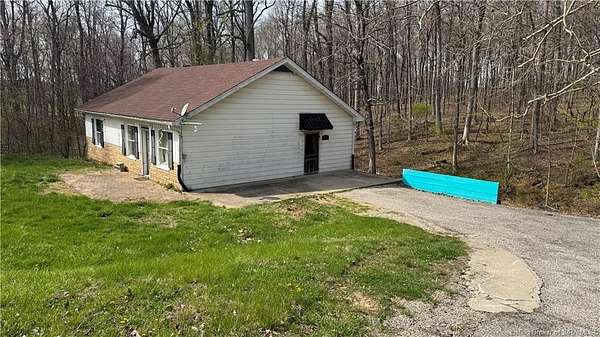 Perfect starter home or investment property!Charming Country Cottage in a Convenient Location on 1.5 acres! Discover the comfort of peaceful living with a private backyard overlooking a wooded backdrop. A scenic creek bed rests at the foot of the hill, offering a tranquil natural setting right out your back door. Inside, the farmhouse-style kitchen is generously sized and filled with natural light. It features painted wood cabinets and a pantry-an inviting space with classic country character. The main living area offers REAL WOOD parquet floors, a large living room, split-bedroom layout, and a floor plan that's easy to maintain. With its south-facing orientation, the living room enjoys natural sunlight throughout the day. Additional highlights include: Updated windows, partial basement with outside access-great for storage, New roof, Easy to show. Conveniently located 15 minutes from New Albany, less than 10 minutes to the casino, and close to both a park and golf course, this property blends comfort with accessibility. Sq ft and room sizes are approximate. Seller is willing to look at lease and on contract sale.