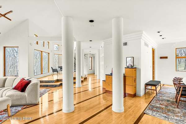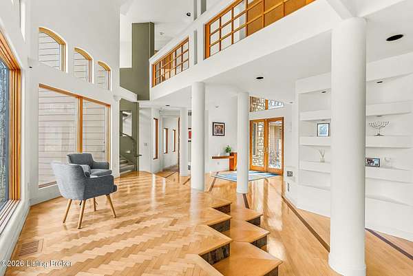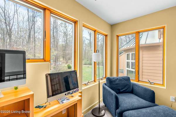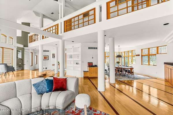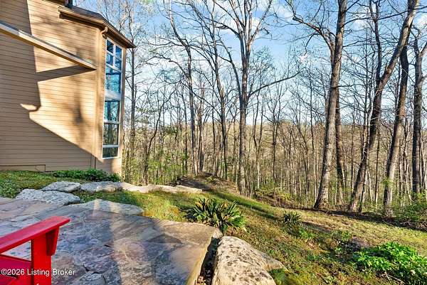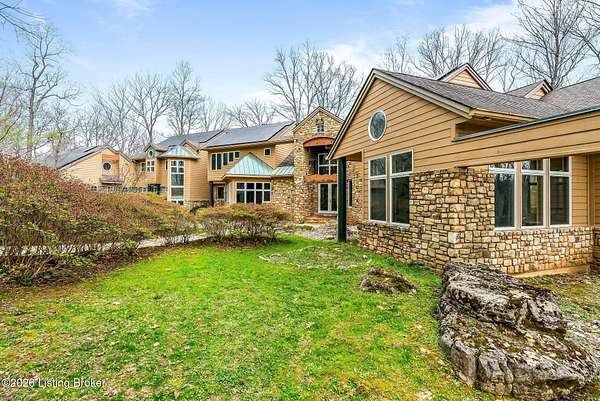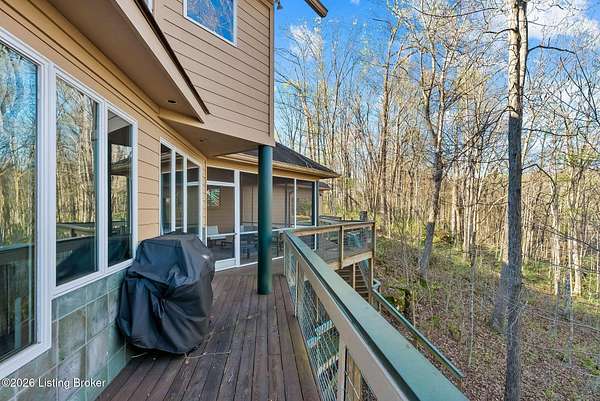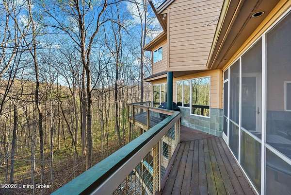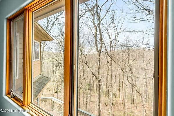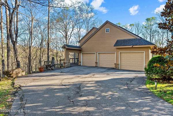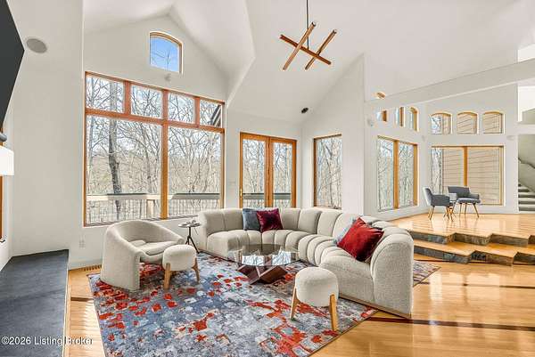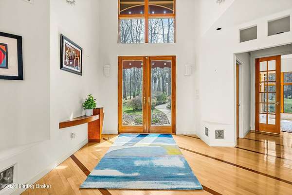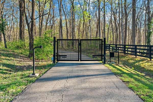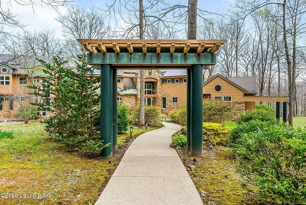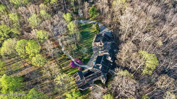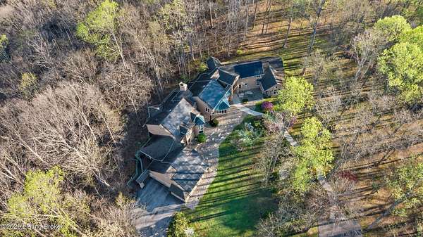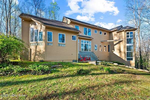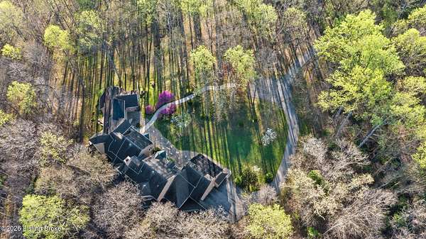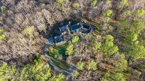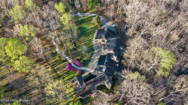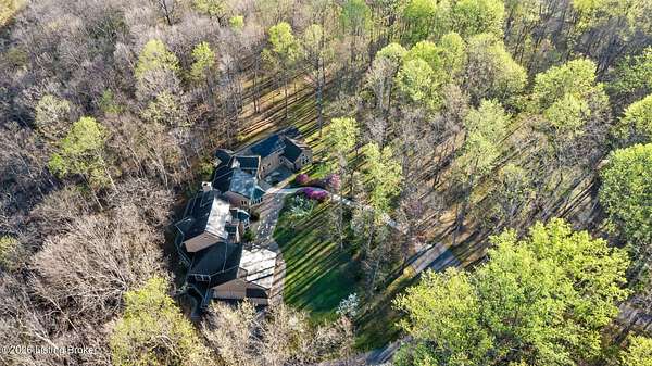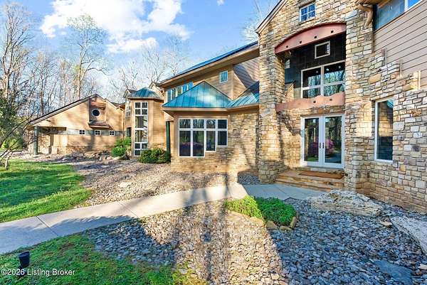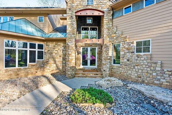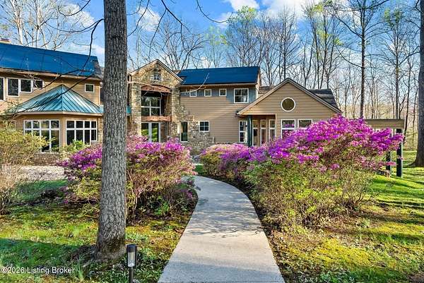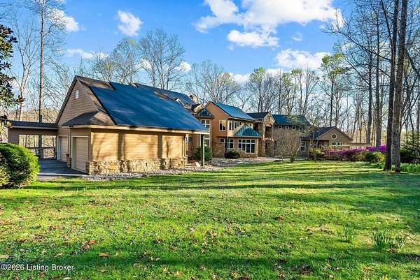 Welcome to an architectural masterpiece by architect Jim Peterson set on over 10 private, wooded acres overlooking the waters of Harrods Creek in highly sought-after North Oldham County, Kentucky. This one-of-a-kind residence seamlessly blends modern luxury with the serenity of nature, offering an unparalleled lifestyle defined by privacy, beauty, and thoughtful design. From the moment you arrive, the home captivates with its distinctive architecture and peaceful surroundings. Enhanced with state-of-the-art solar panels, the property offers exceptional energy efficiency without compromising comfort or style. Inside, the home features 4 spacious bedrooms and 7 elegantly appointed bathrooms. The first-floor primary wing serves as a true private retreat, complete with a spa-inspired ensuite bath featuring heated floors, a heated towel rack, dual vanities, a whirlpool tub, and a separate glass-enclosed shower. This luxurious suite is further complemented by a private exercise room and an in-suite home office, creating a sanctuary designed for both relaxation and productivity. The main level is perfectly curated for everyday living and entertaining. A grand family room flows effortlessly into the dining area, creating an inviting atmosphere for gatherings. The expansive, light-filled eat-in kitchen is equipped with new appliances, ample cabinet and counter space making it both functional and inspiring-ideal for everything from casual mornings to elevated entertaining. Upstairs, three generously sized bedrooms each feature their own private ensuite bathrooms, providing comfort and privacy for family and guests alike. A beautifully designed home library with custom built-ins and a dedicated study offers a quiet escape for work or leisure. Walls of windows throughout the home frame breathtaking views of the surrounding landscape, seamlessly connecting indoor living with the natural beauty outside. A screened-in porch invites you to relax and unwind while enjoying the tranquil setting in complete comfort. Additional features include a whole home water filtration system + whole-home generator for peace of mind, further enhancing the home's thoughtful design and functionality. This extraordinary property is a rare offering-where luxury, privacy, and nature exist in perfect harmony, all within one of Oldham County's most desirable locations.