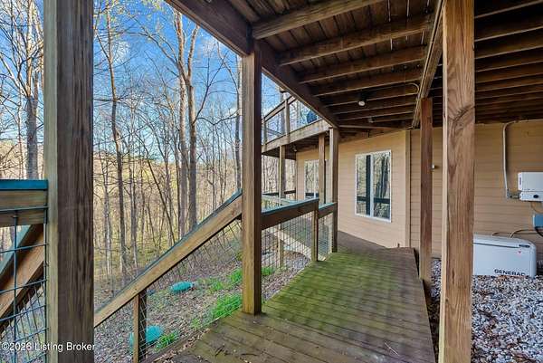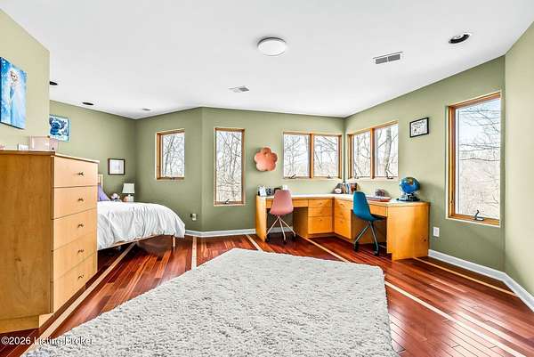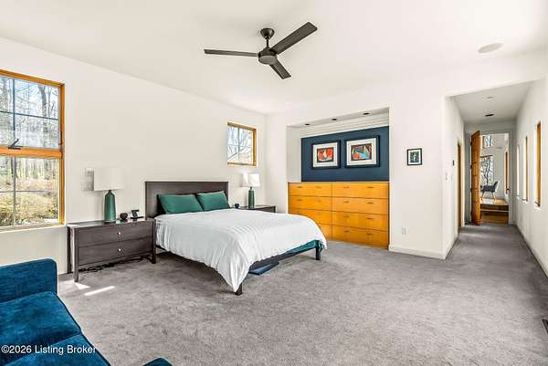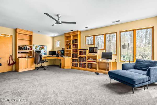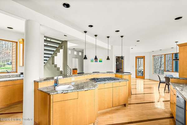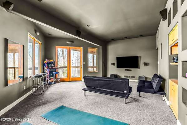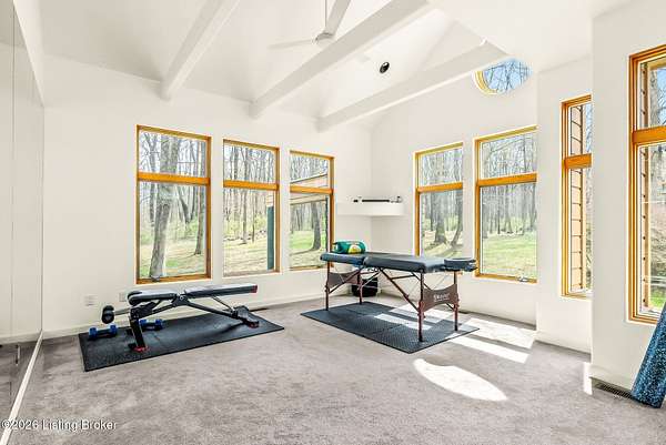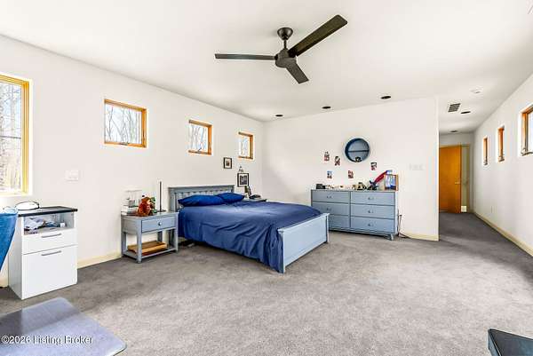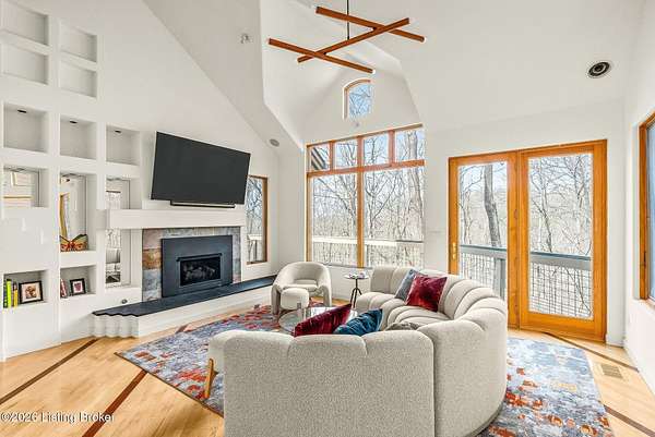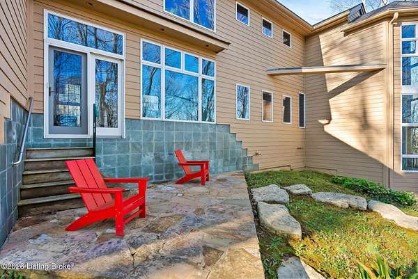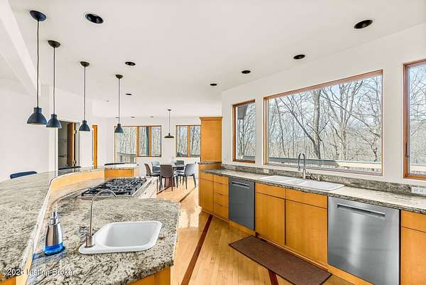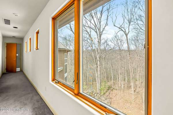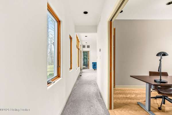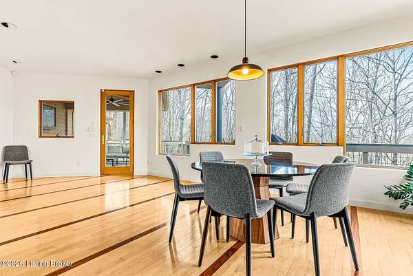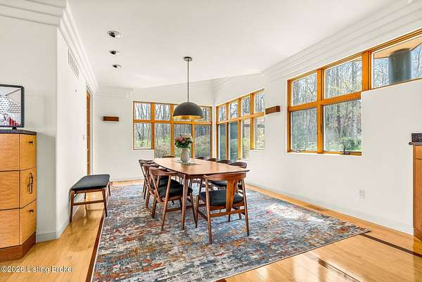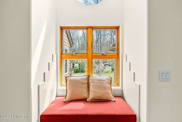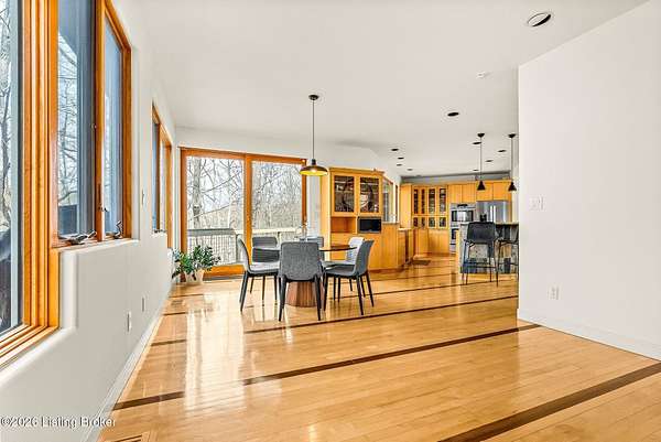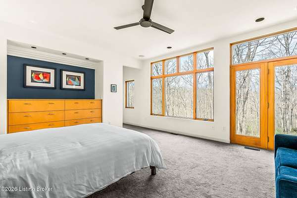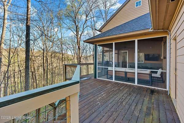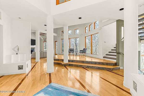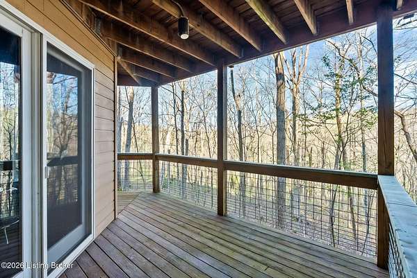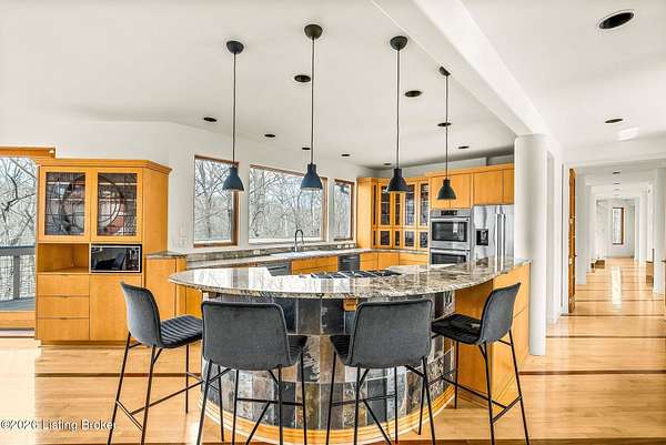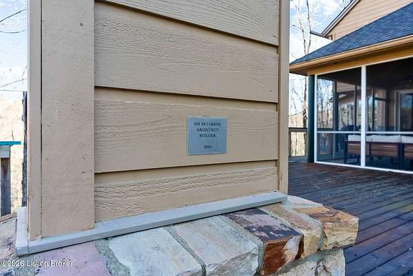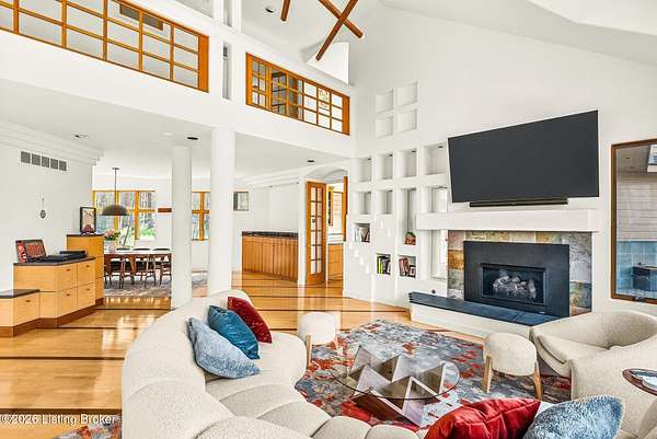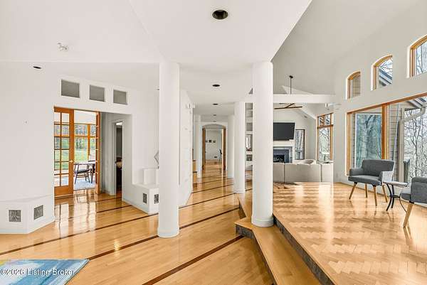 Welcome to an architectural masterpiece by architect Jim Peterson set on over 10 private, wooded acres overlooking the waters of Harrods Creek in highly sought-after North Oldham County, Kentucky. This one-of-a-kind residence seamlessly blends modern luxury with the serenity of nature, offering an unparalleled lifestyle defined by privacy, beauty, and thoughtful design. From the moment you arrive, the home captivates with its distinctive architecture and peaceful surroundings. Enhanced with state-of-the-art solar panels, the property offers exceptional energy efficiency without compromising comfort or style. Inside, the home features 4 spacious bedrooms and 7 elegantly appointed bathrooms. The first-floor primary wing serves as a true private retreat, complete with a spa-inspired ensuite bath featuring heated floors, a heated towel rack, dual vanities, a whirlpool tub, and a separate glass-enclosed shower. This luxurious suite is further complemented by a private exercise room and an in-suite home office, creating a sanctuary designed for both relaxation and productivity. The main level is perfectly curated for everyday living and entertaining. A grand family room flows effortlessly into the dining area, creating an inviting atmosphere for gatherings. The expansive, light-filled eat-in kitchen is equipped with new appliances, ample cabinet and counter space making it both functional and inspiring-ideal for everything from casual mornings to elevated entertaining. Upstairs, three generously sized bedrooms each feature their own private ensuite bathrooms, providing comfort and privacy for family and guests alike. A beautifully designed home library with custom built-ins and a dedicated study offers a quiet escape for work or leisure. Walls of windows throughout the home frame breathtaking views of the surrounding landscape, seamlessly connecting indoor living with the natural beauty outside. A screened-in porch invites you to relax and unwind while enjoying the tranquil setting in complete comfort. Additional features include a whole home water filtration system + whole-home generator for peace of mind, further enhancing the home's thoughtful design and functionality. This extraordinary property is a rare offering-where luxury, privacy, and nature exist in perfect harmony, all within one of Oldham County's most desirable locations.