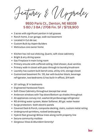Welcome to 9930 Paris Court where sophistication meets country! This stunning ranch style home on 3 acres is in impeccable condition and feels a lot like new construction. With 5 bedrooms and 3 bathrooms this home has all those extra touches you have to see to experience with tons of custom building concepts throughout. This home is very well equipped for entertaining or simply enjoying all the feels and views country living provides! The open concept capitalizes on the natural light while also providing a shaded deck and patio areas for the warmer season. The primary suite offers a custom tiled shower and direct and convenient access to the laundry and mudroom areas. The walk-out basement was designed exceptionally well and features a built in bar area, a huge rec and living area, 2 extra bedrooms, bath, and plenty of storage. Easily accessible to all that Lincoln offers with covenants allowing for outbuildings and best of all no HOA fees! Call to schedule your private showing today!